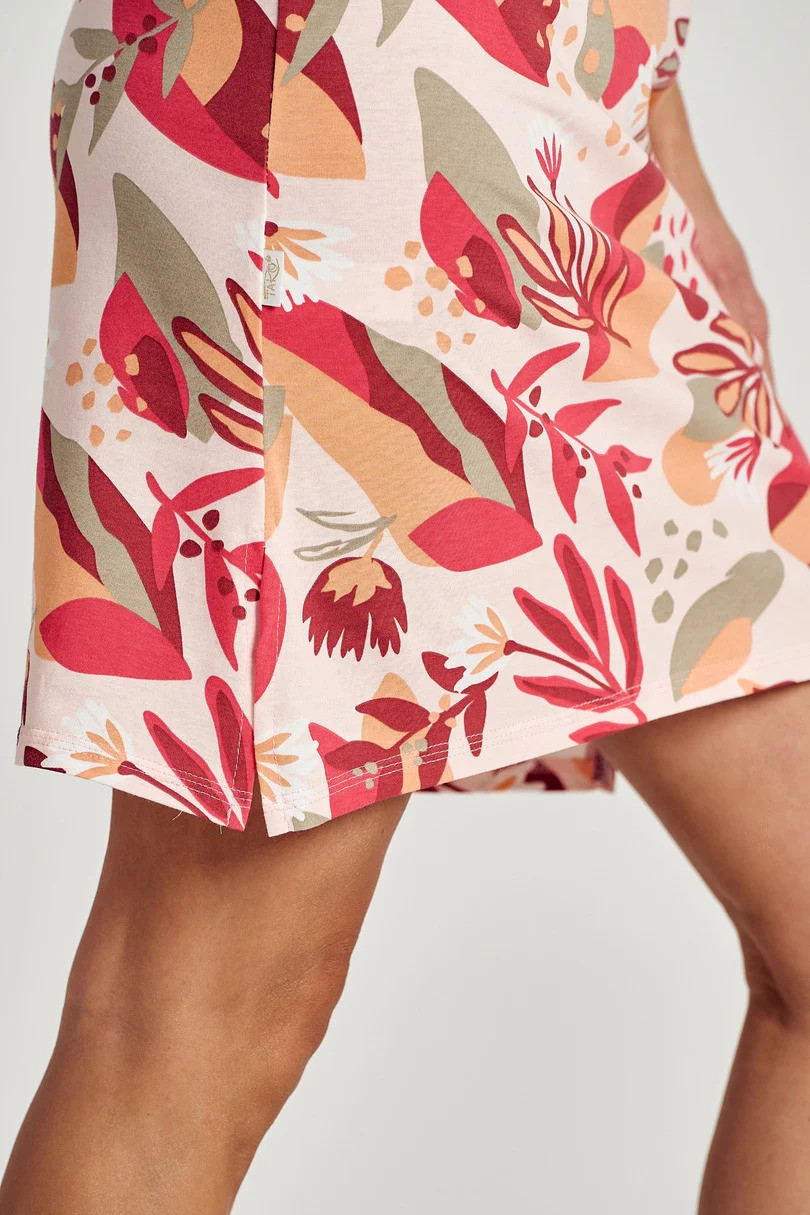 Dámská košile s krátkým rukávem, vyrobená ze vzorované jemné bavlny. Kulatý výstřih, délka košile před kolena, jemné boční rozparky.