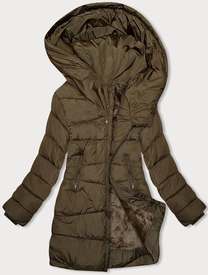 Bunda je zateplená syntetickou péřovou výplní, má kožešinovou podšívku, má dvě kapsy a zapíná se dvoustranným zipem. Model má kapuci, kterou není možné odepnout. Bunda má stojáček se zapínáním na patentky. Model má délku do poloviny stehen.