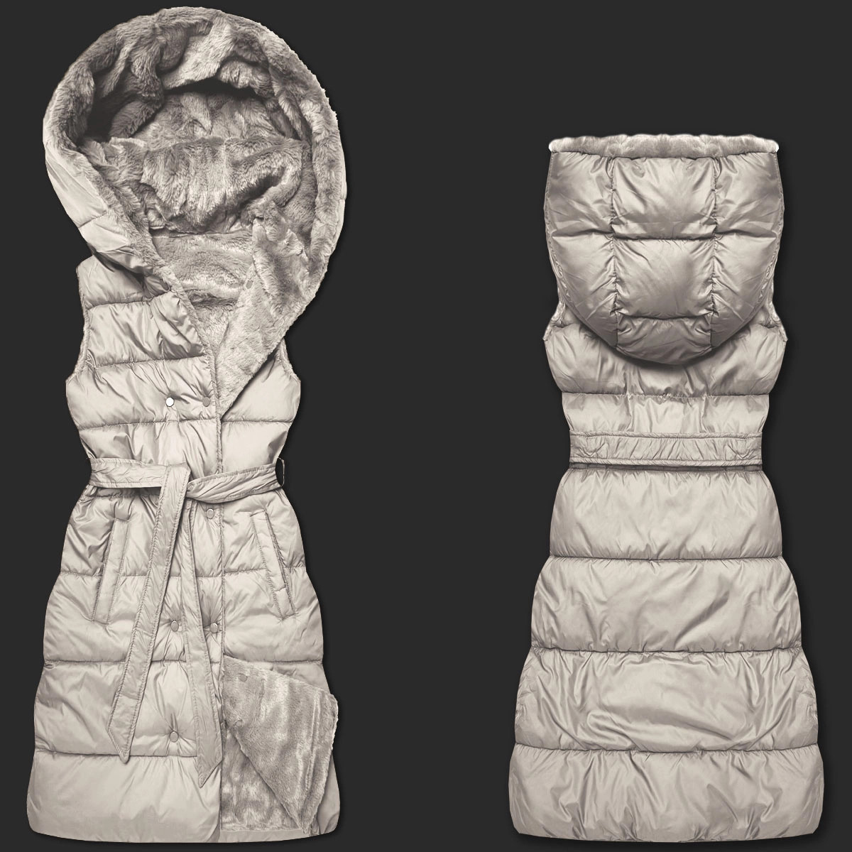 Vesta je zateplená syntetickou péřovou výplní, má pásek pro zavazování, dvě kapsy bez zapínání a zapíná se zipem a panelem s patentkami. Model má kapuci, kterou není možné odepnout. Vesta má délku do poloviny stehen.