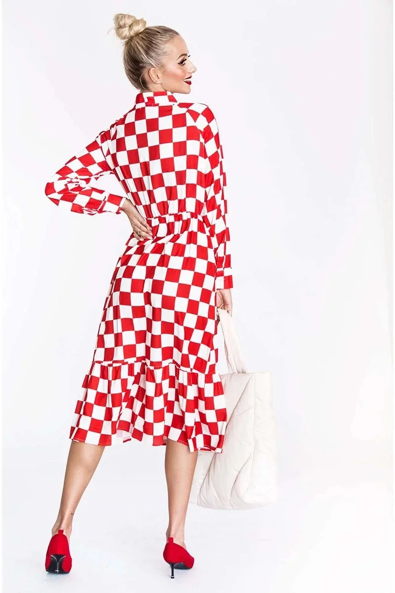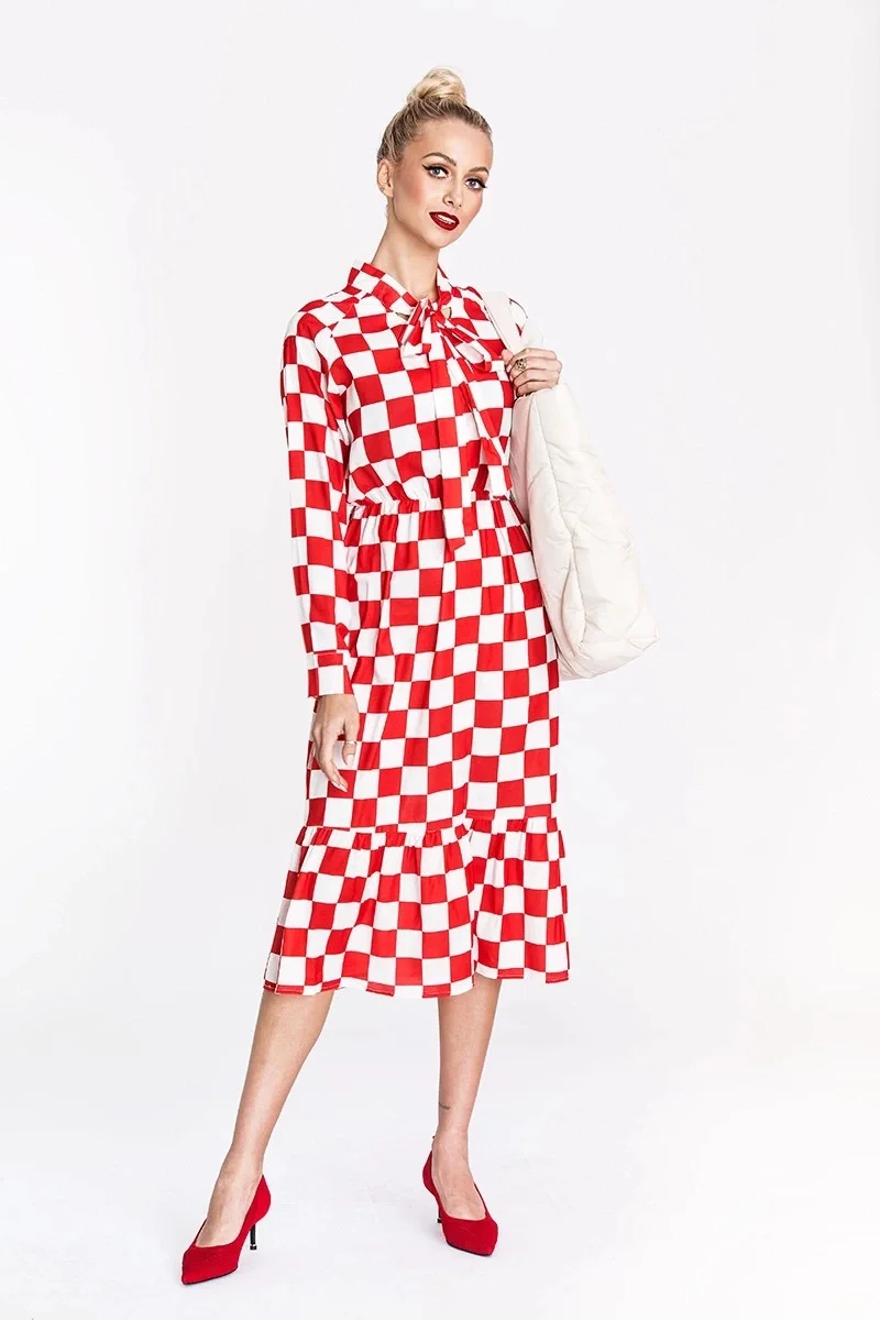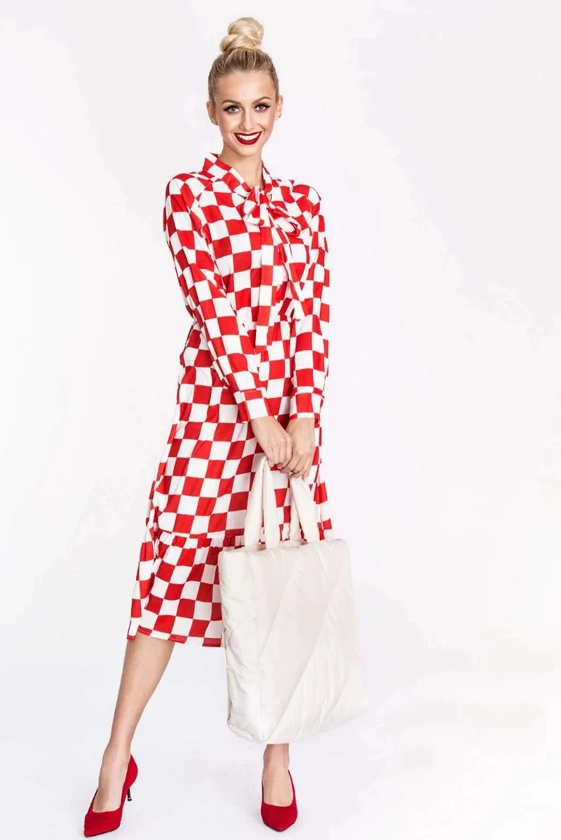 Přidání recenze k Bílo-červené dámské kárované šaty s vázáním ve výstřihu Ann Gissy (XY202117)