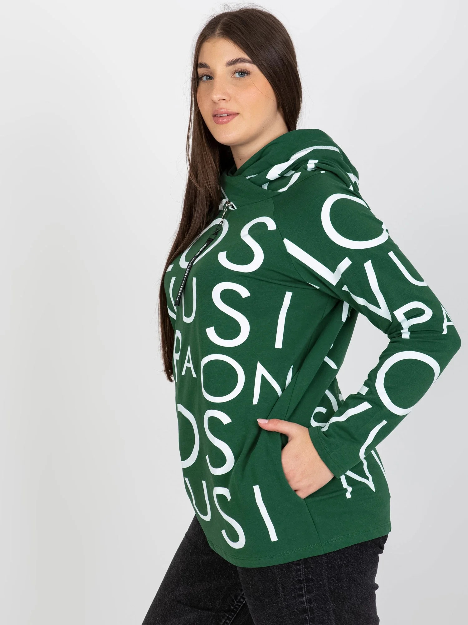 Tmavě zelená plus size mikina s kapucí a potiskem .