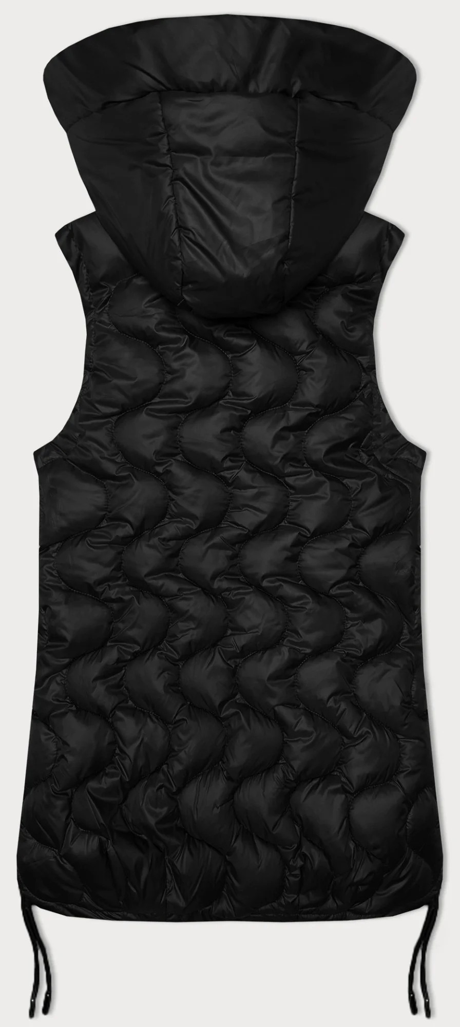 Vesta má trapézový střih, je lehce zateplená, má dvě kapsy bez zapínání a zapíná se stříbrným zipem. Model má stahovací boky a délku pod boky.