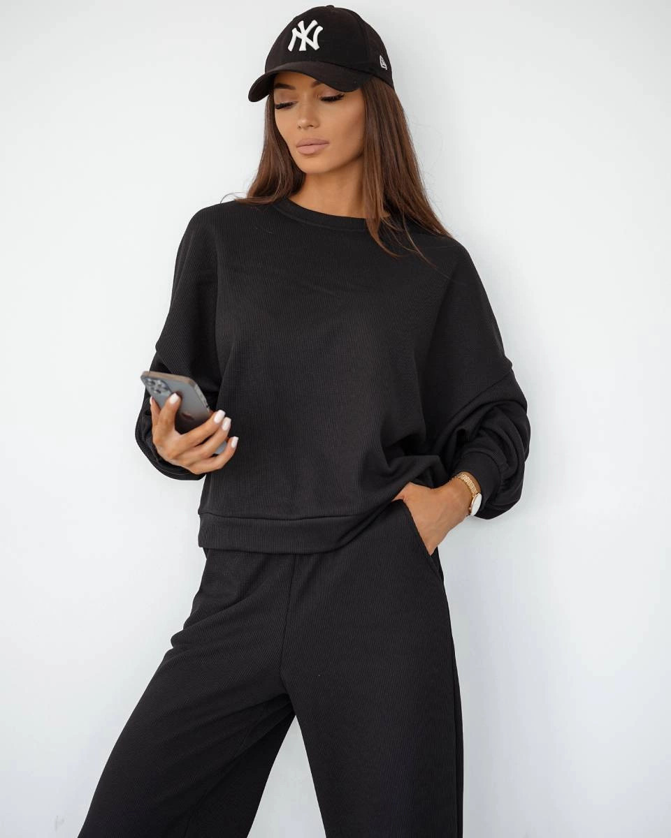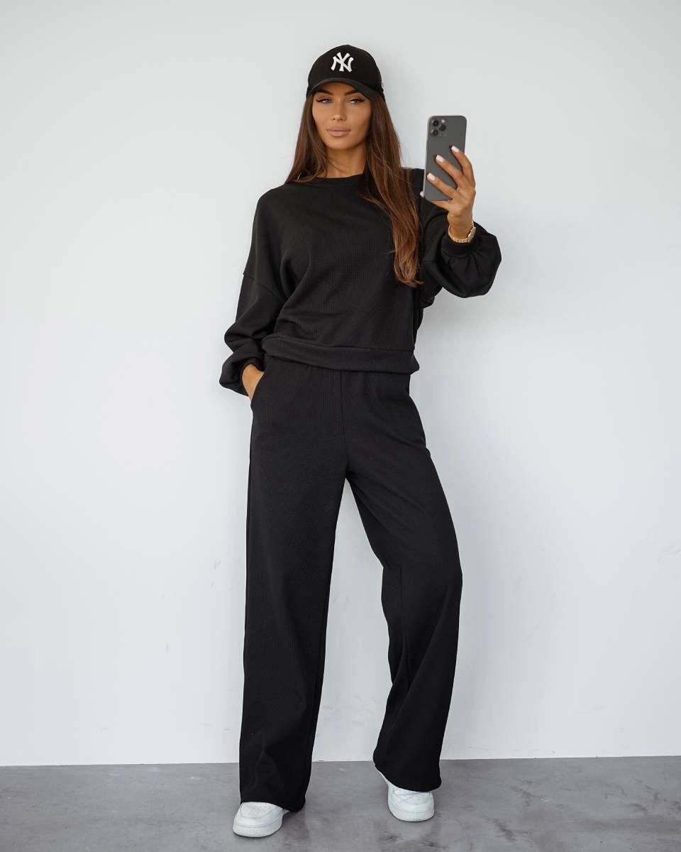 Černý dámský komplet s vaflovou strukturou - mikina a kalhoty (821108)