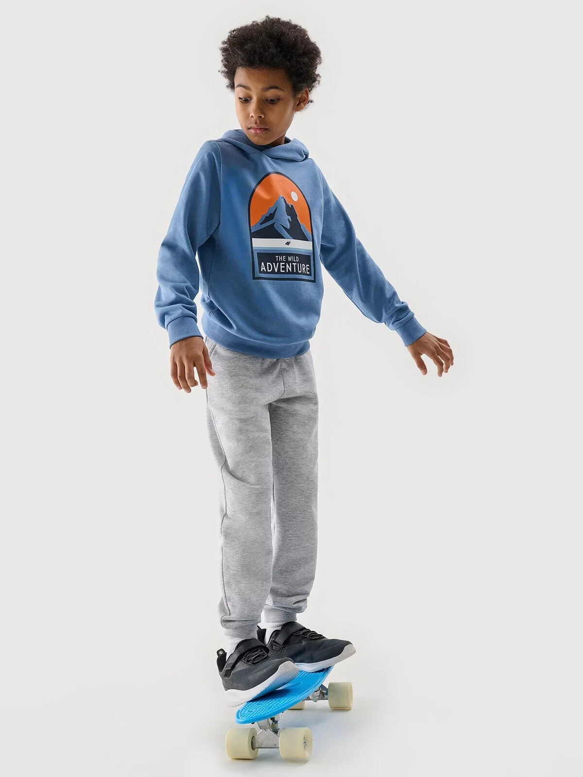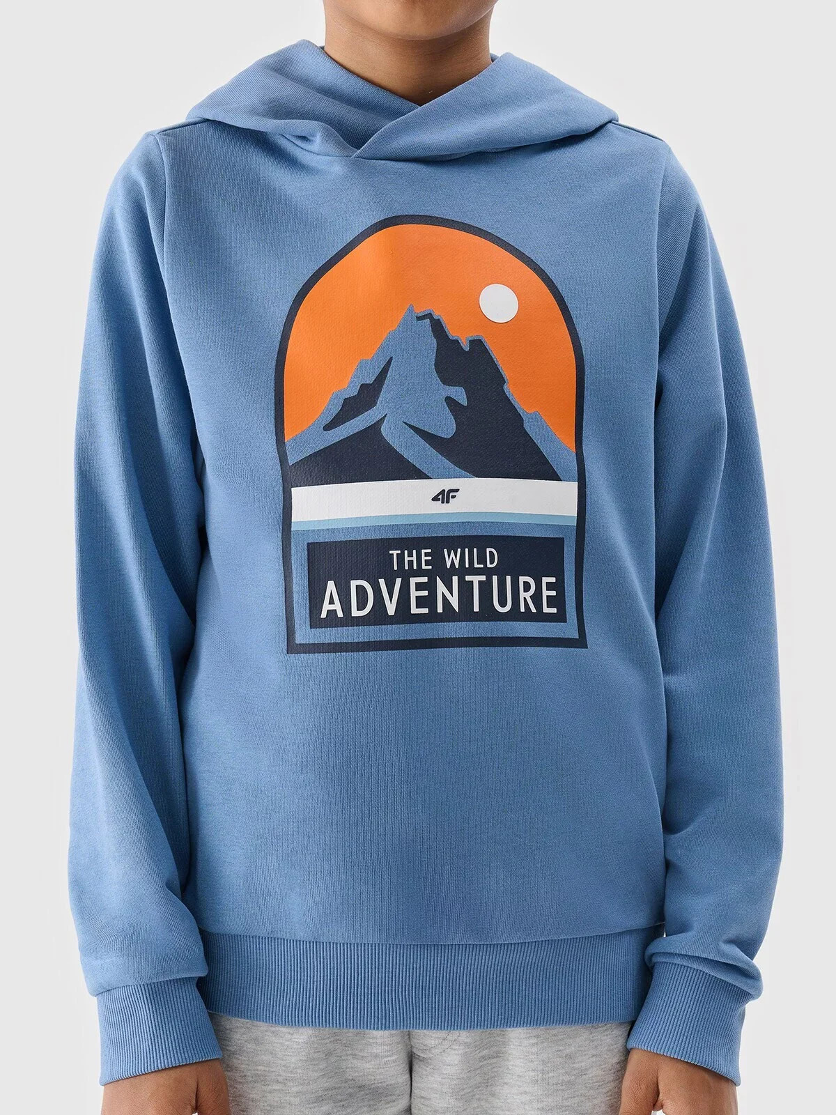 Integrovaná kapuce u výstřihu. Elastické žebrované manžety. Na přední straně je viditelný potisk "The Wild Adventure". Klasický střih bez kapes. Mikina přes hlavu. Spodní část s širokým lemem