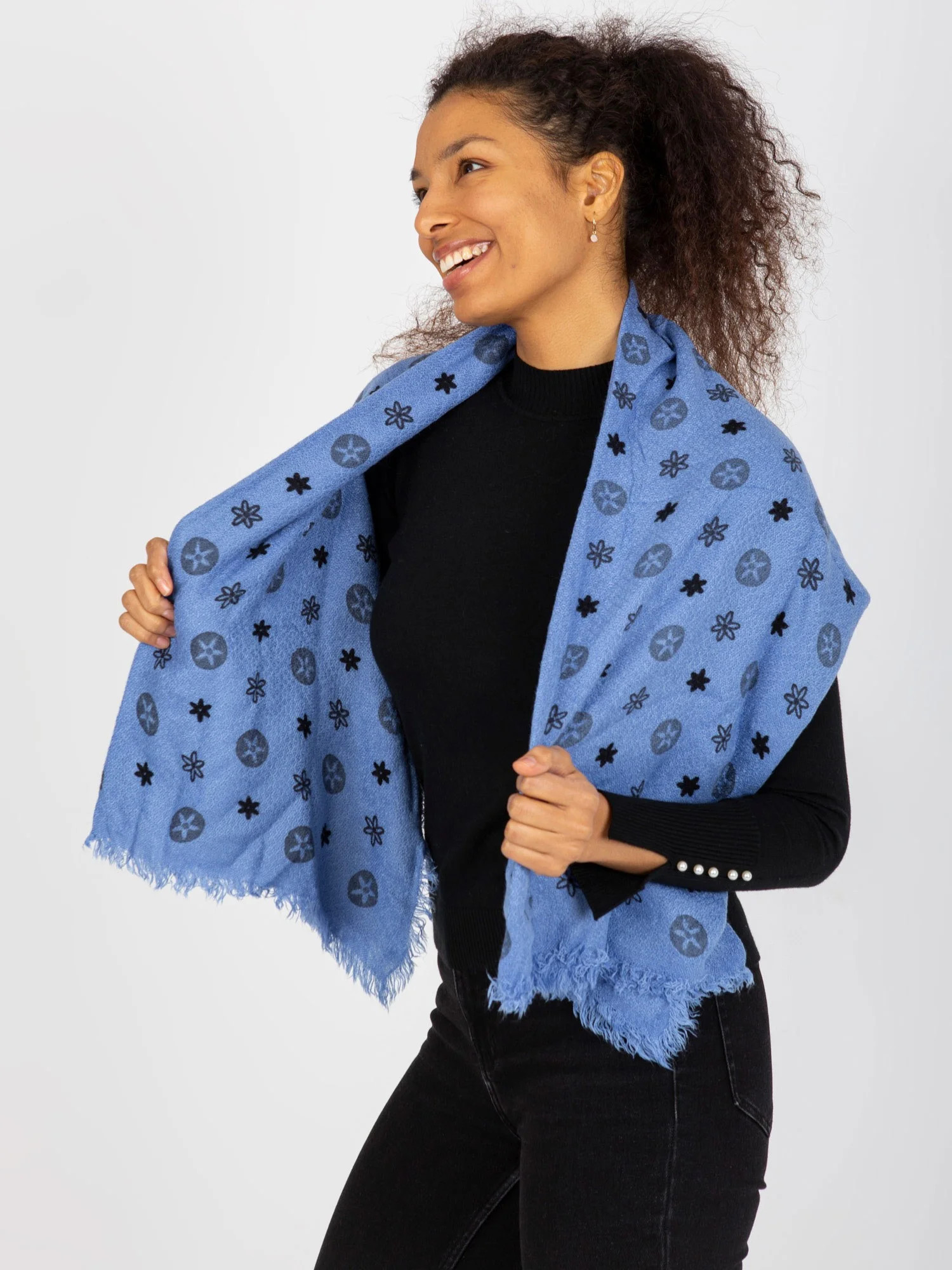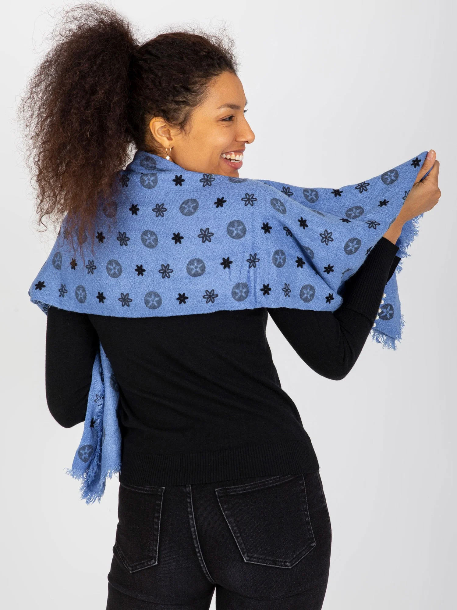 Modrý dámský šátek s potiskem .