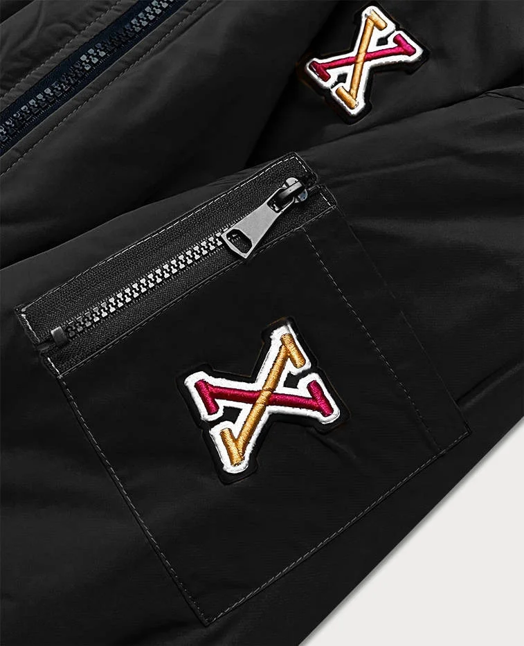 Bunda má střih typu parka, je zateplená syntetickou péřovou výplní a má dvě kapsy. Model má stojáček, který přechází do kapuce olemované kožešinou. Zatímco kapuci není možné odepnout, kožešinu odepnout lze (připíná se knoflíčky). Kožešina se táhne na panelu/záložce. V pase modelu jsou kontrastní stahující šňůrky. Ve přední části bundy a na kapse na rameni je ozdobná nášivka. Bunda má navíc vzadu imitaci kapes a barevnou aplikaci.