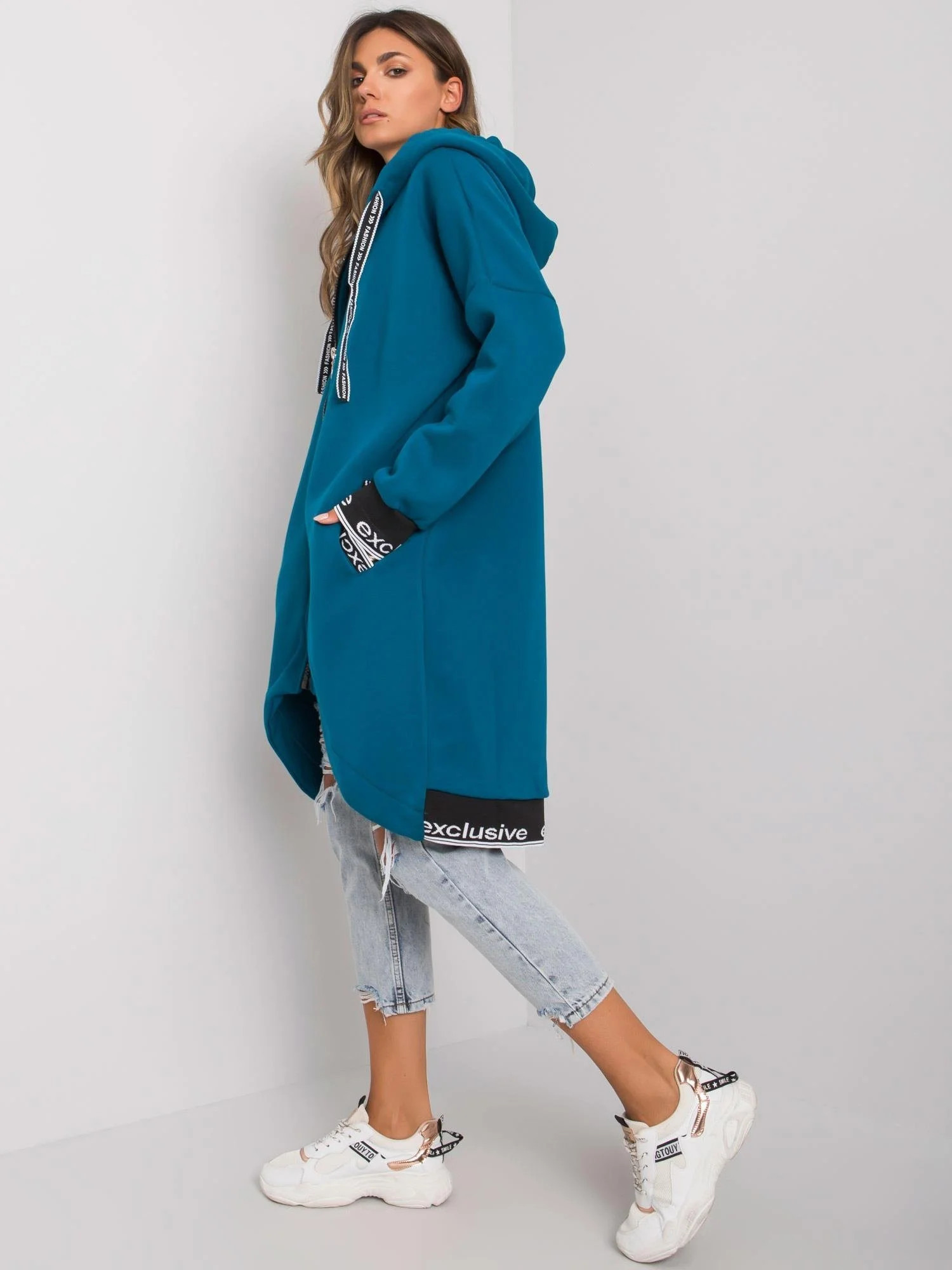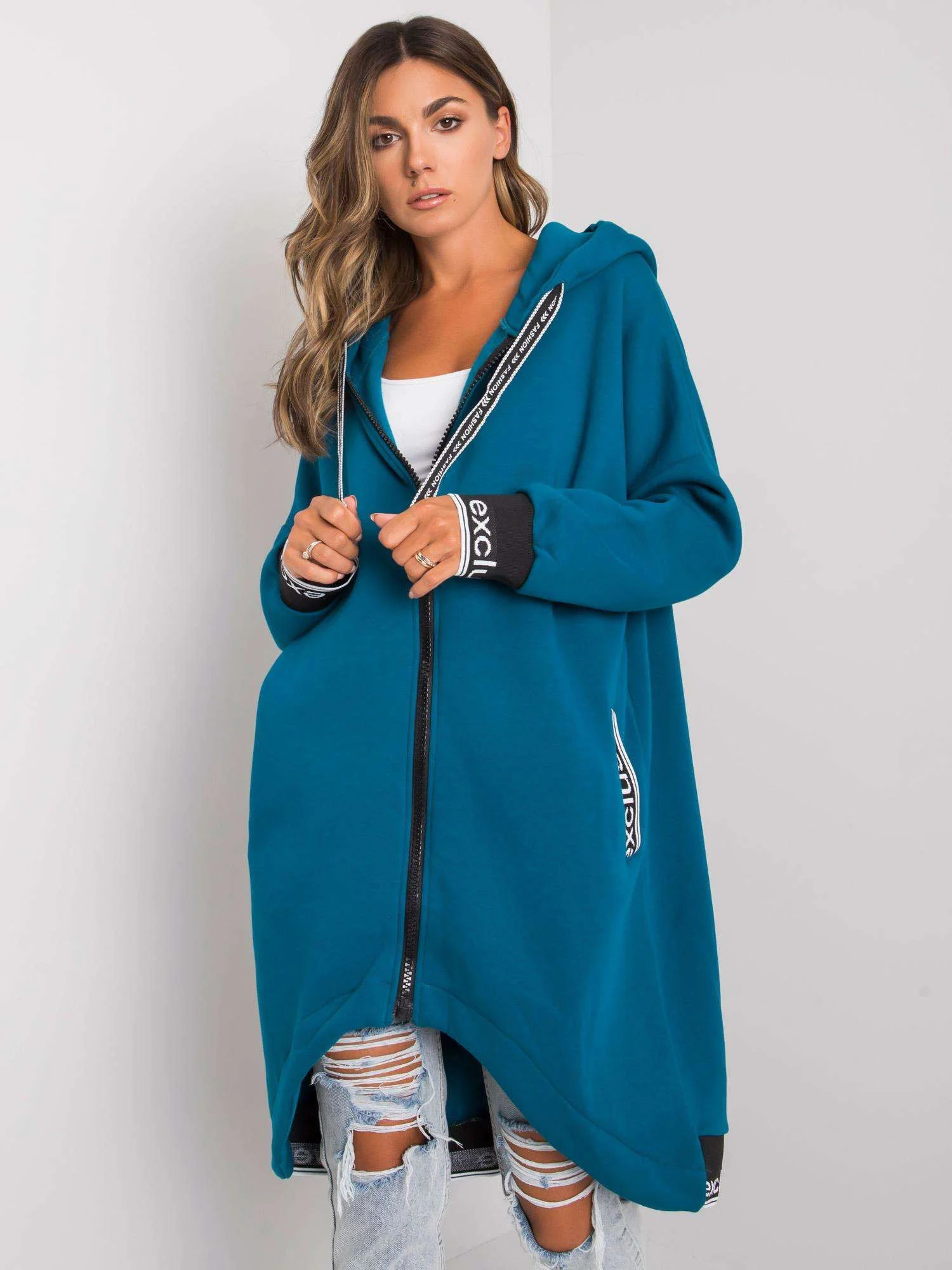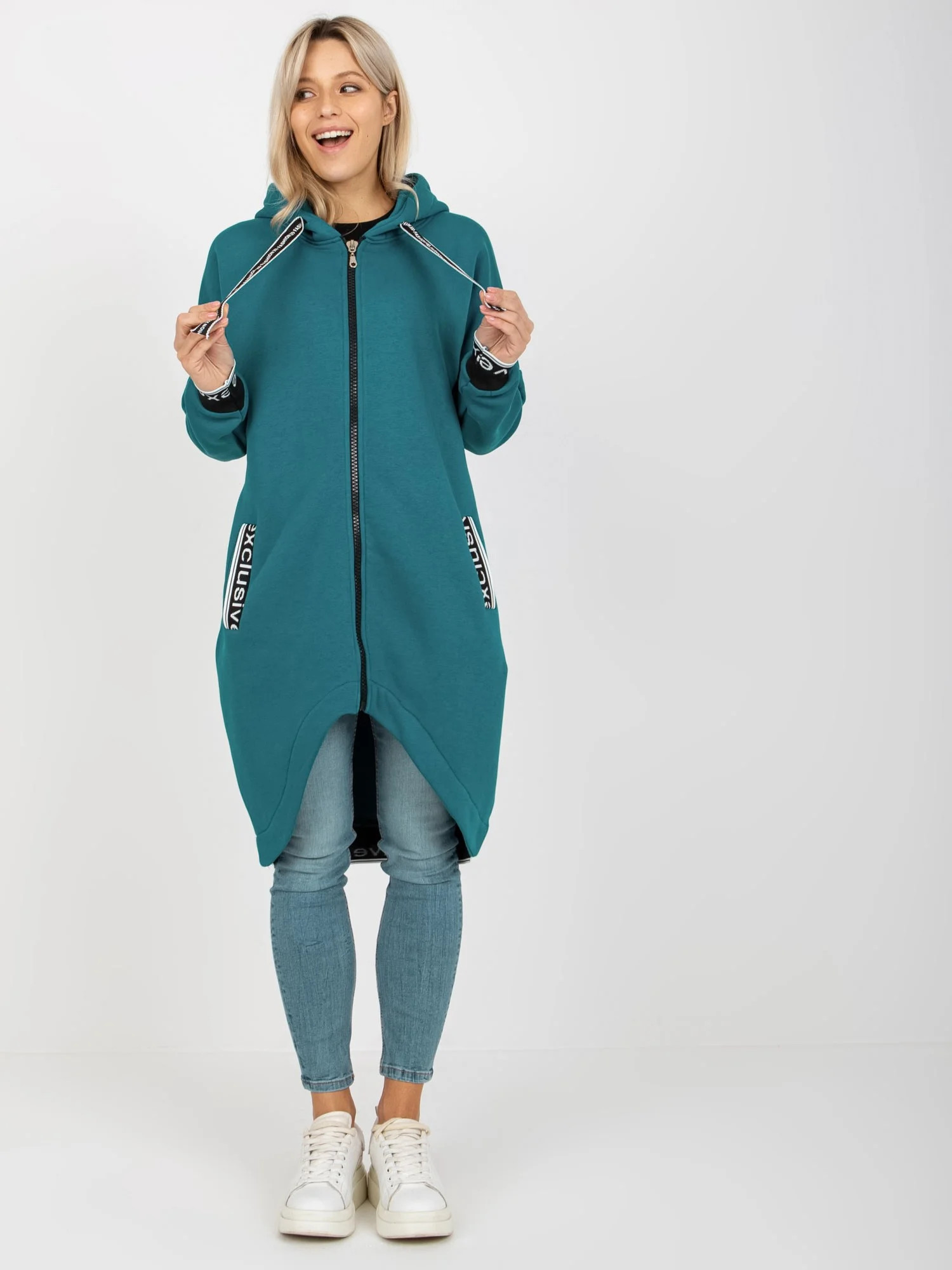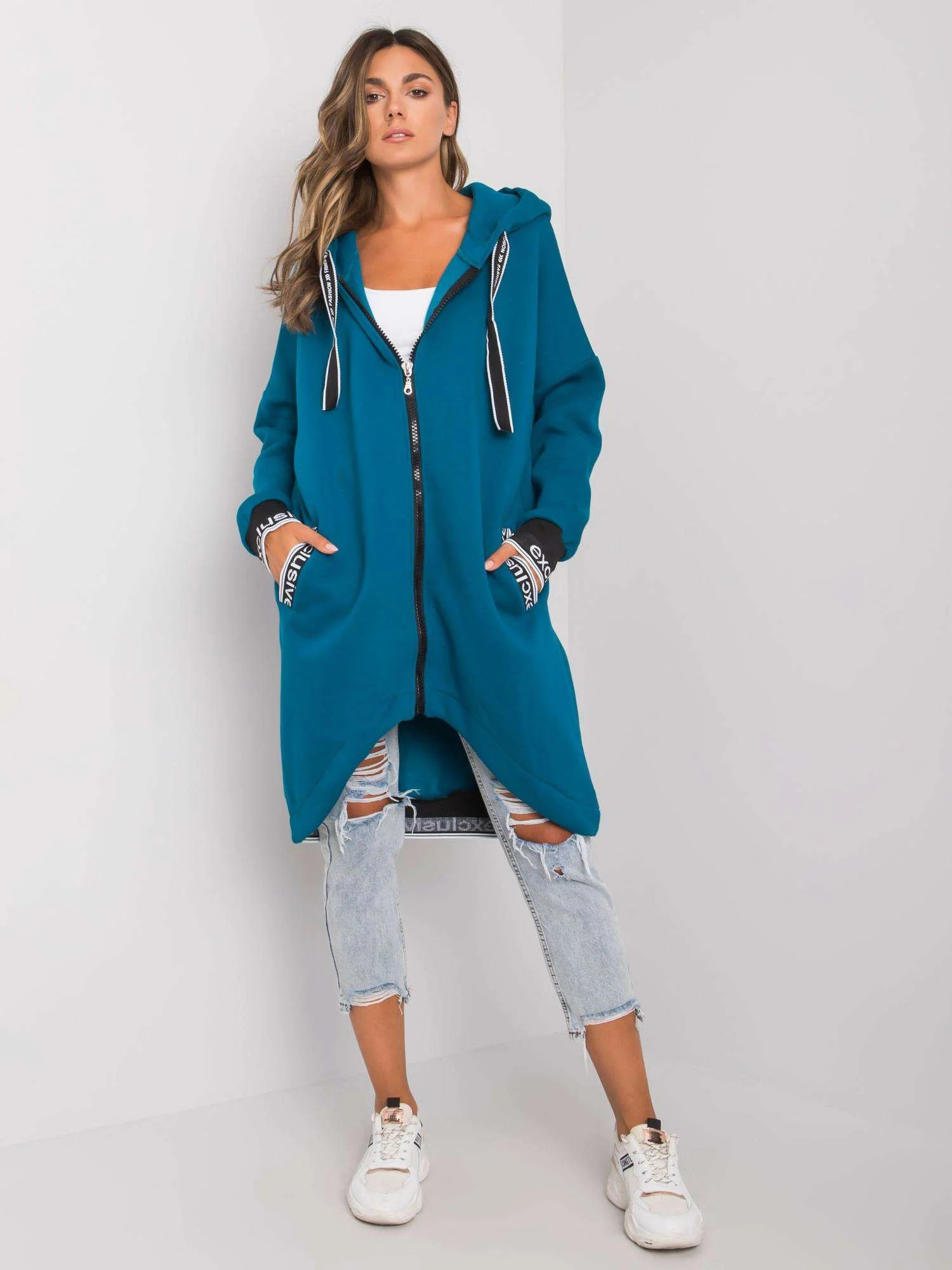 Mikina je vypasovaná, má dvě kapsy a zapíná se zipem. Model má kapuci, kterou není možné odepnout. Mikina je olemovaná stahovacími lemy a má délku k bokům.