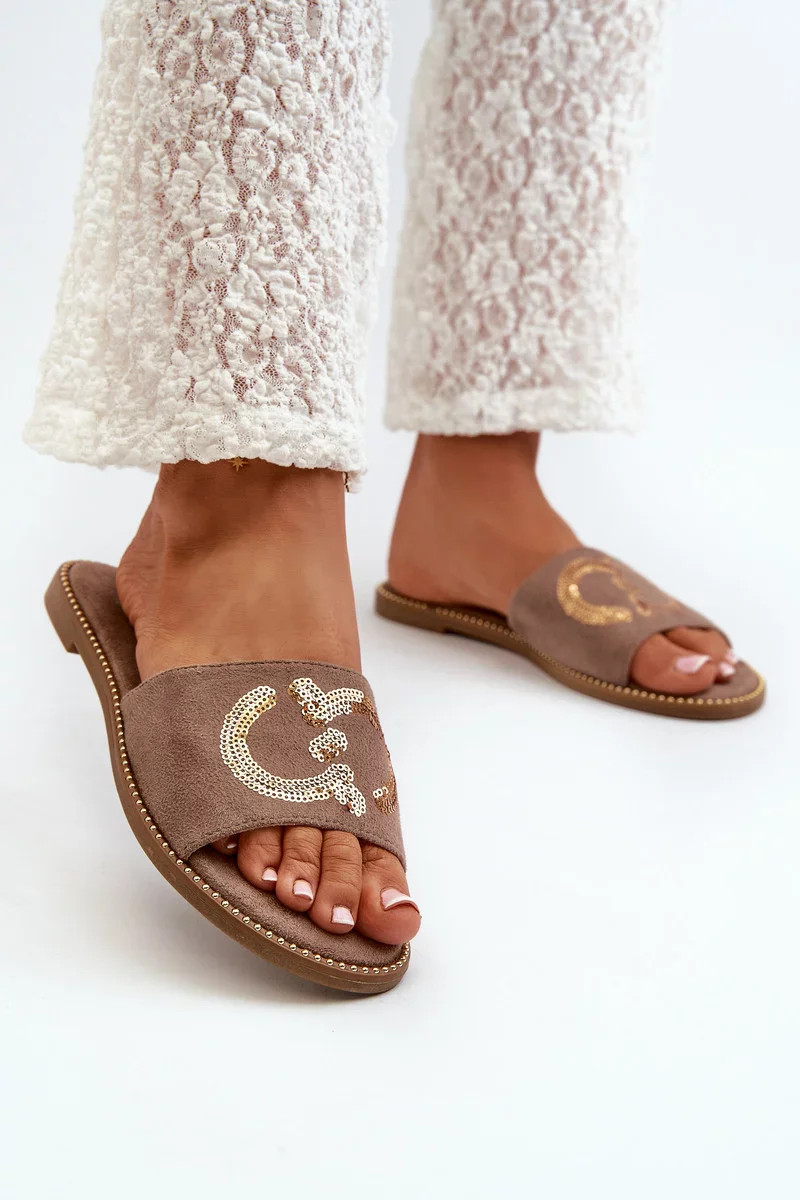 Dámské ploché pantofle s flitry S.Barski Hnědá
