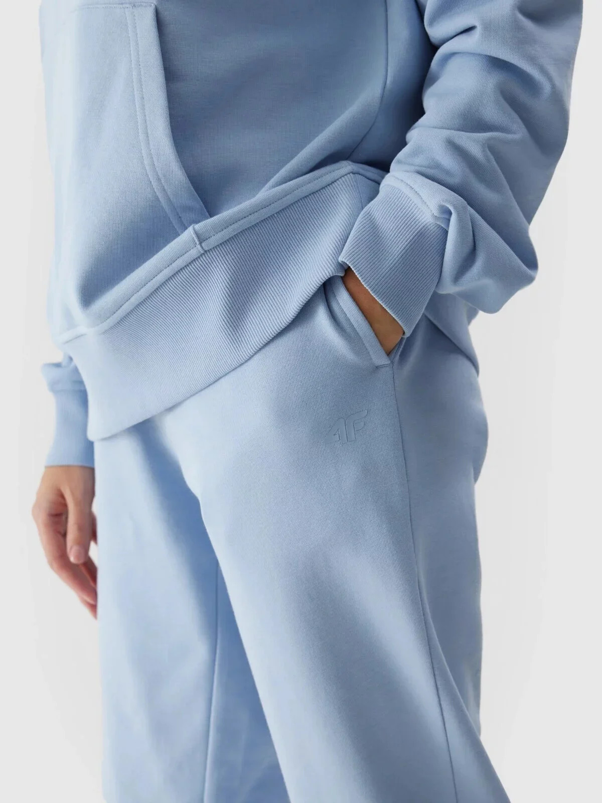 Dámské tepláky 4F jsou vyrobeny ze 77% bavlny, díky čemuž jsou měkké, odolné a příjemné na dotek. Díky přídavku polyesteru (23%) si materiál zachovává svůj střih a je odolný vůči opotřebení i po mnoho sezón. Kalhoty jsou bez podšívky, takže jsou lehčí a vhodné pro teplejší dny. Na bocích jsou 2 otevřené kapsy. Elastický pás s vnitřním nastavením na šňůrky.