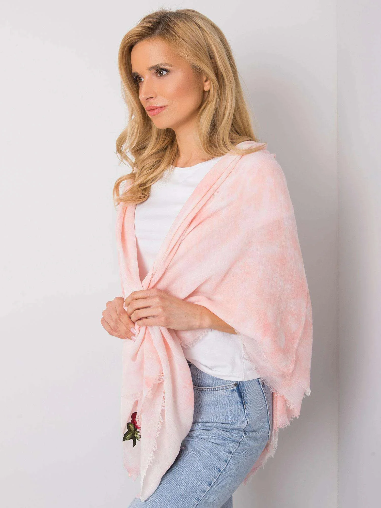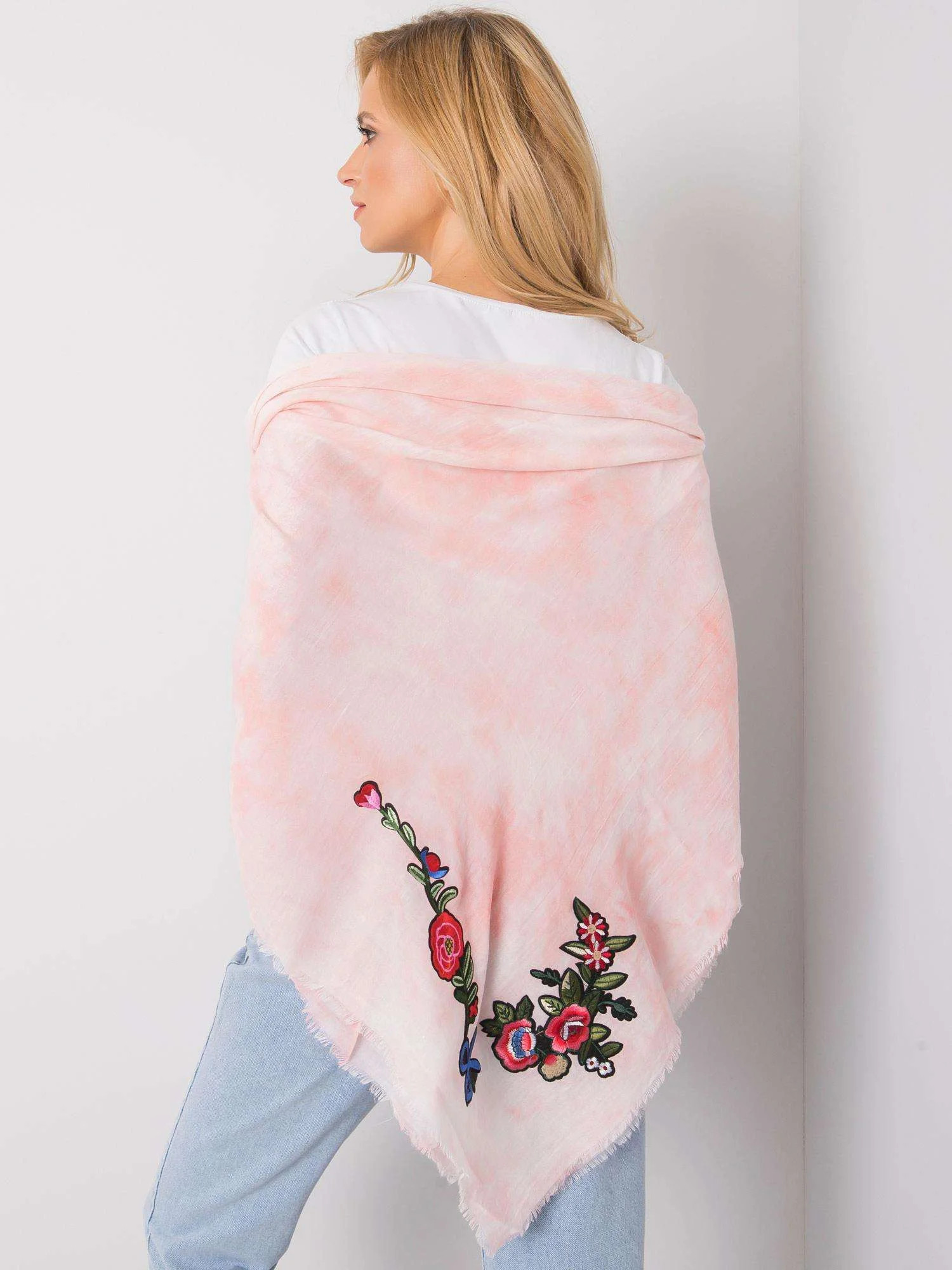 Růžová dámská šála s barevnými nášivkami.