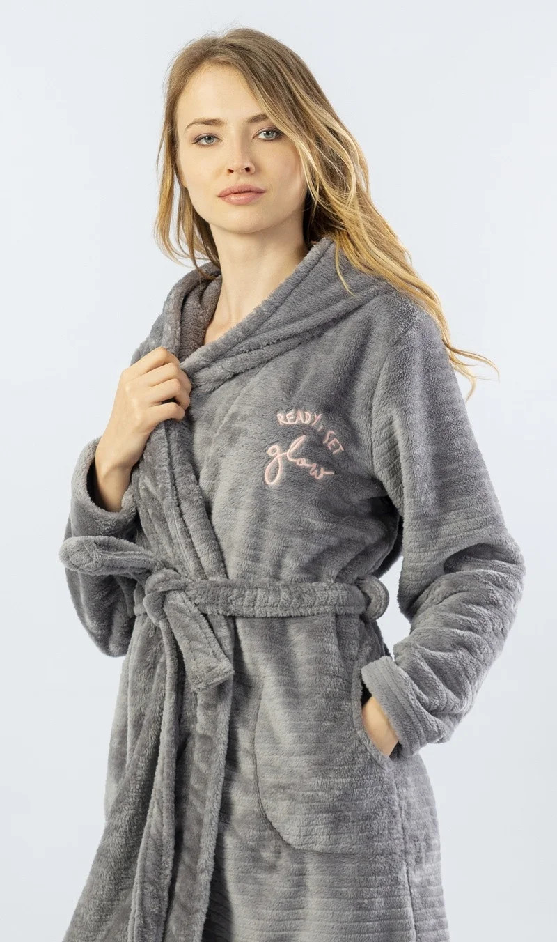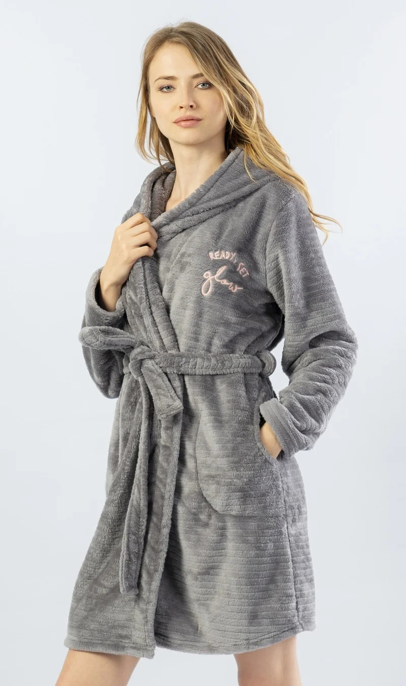 Dámský krátký softový župan s kapucí Monika. Hřejivý župánek v příjemné šedé barvě má praktické kapsy, pásek ke stažení a kapuci. Na přední straně je drobný anglický nápis v růžové barvě, který doslovně znamená "Připravena zářit". Použitý softový materiál je jemný a poddajný na dotek.