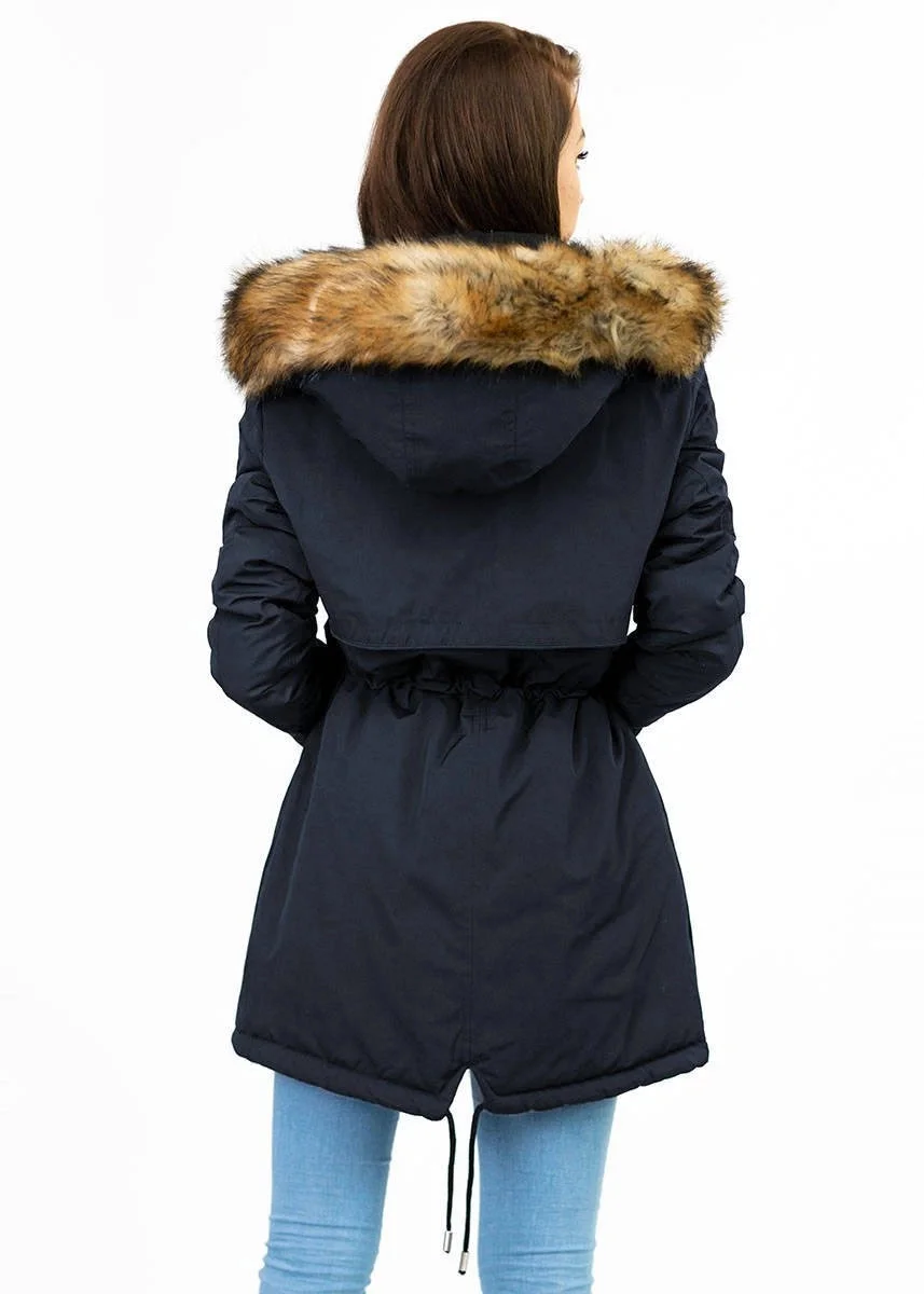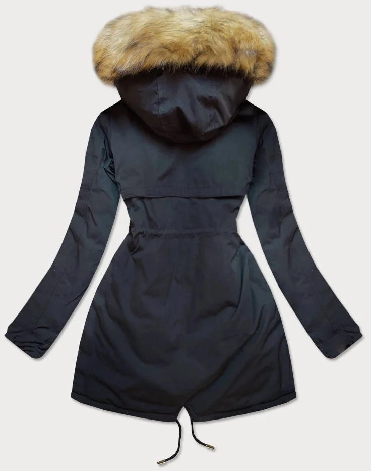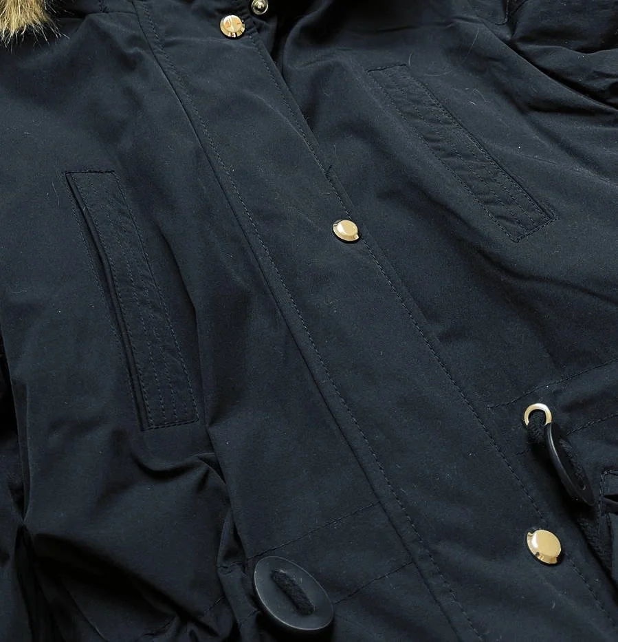 Jedna strana bundy je hladká a druhá je prošívaná. Bunda má střih typu parka, je zateplená velmi kvalitní syntetickou péřovou výplní, na každé straně bundy jsou dvě kapsy, z toho na hladké straně se zapínají patkou s patentkou a jsou ozdobené zipem a na prošívané straně se zapínají patentkami. Na hladké straně bundy jsou navíc dvě imitace kapes se zapínáním na patentky. Model se zapíná dvoustranným zipem a na hladké straně se navíc zapíná patentkami. Bunda má stojáček a kapuci se stahujícími šňůrkami se stopery. Kapuci je možné odepnout (připíná se zipem). Kapuce je olemovaná kožešinou, kterou je možné odepnout (připíná se knoflíčky). V pase modelu jsou stahující šňůrky se stopery, díky kterým je možné bundu vypasovat. Všechny zipy a patentky mají stříbrnou barvu. Na koncích rukávů jsou patky se zapínáním na patentky.