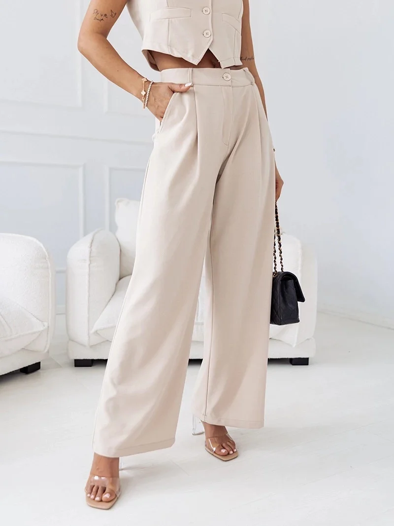 Elegantní béžový dámský komplet - krátká vesta a široké kalhoty (VE90)
