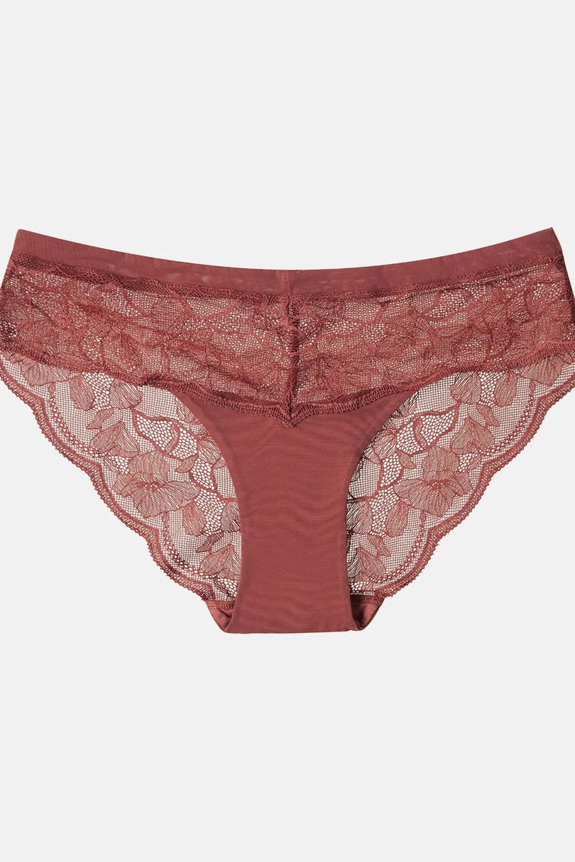 Figi damskie o klasycznym kroju wykonanae z koronki o kwiatowym motywie. W pasie elastyczna gumeczka obszyta siateczką.