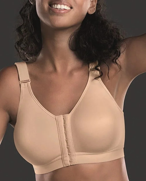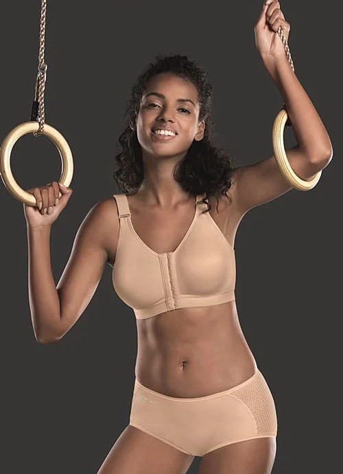 Profesionální sportovní podprsenka Anita. Zapíná se vpředu na háčky. Bezešvé košíčky dokonale podrží i větší prsa, neomezují v pohybu. Sportovní podprsenka Anita frontline poskytuje pevnou oporu poprsí při sportech vyžadujících středně intenzivní pohyb.