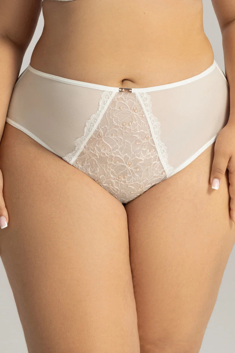 Odkryj elegancję i komfort w jednym – pełne figi w kolorze ecru to bielizna, która podkreśla kobiecość i zapewnia idealne dopasowanie. Przód majtek ozdobiony jest misterną, kwiatową koronką z delikatnym połyskiem i haftem, co nadaje całości wyjątkowego, luksusowego charakteru. Elastyczne boki i tył wykonane z miękkiej siateczki delikatnie opinają sylwetkę, zapewniając wygodę przez cały dzień. Subtelna kokardka z biżuteryjnym detalem dopełnia romantyczny styl. To idealna propozycja dla kobiet ceniących jakość i estetykę – bez kompromisów.