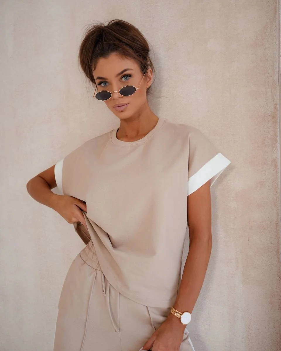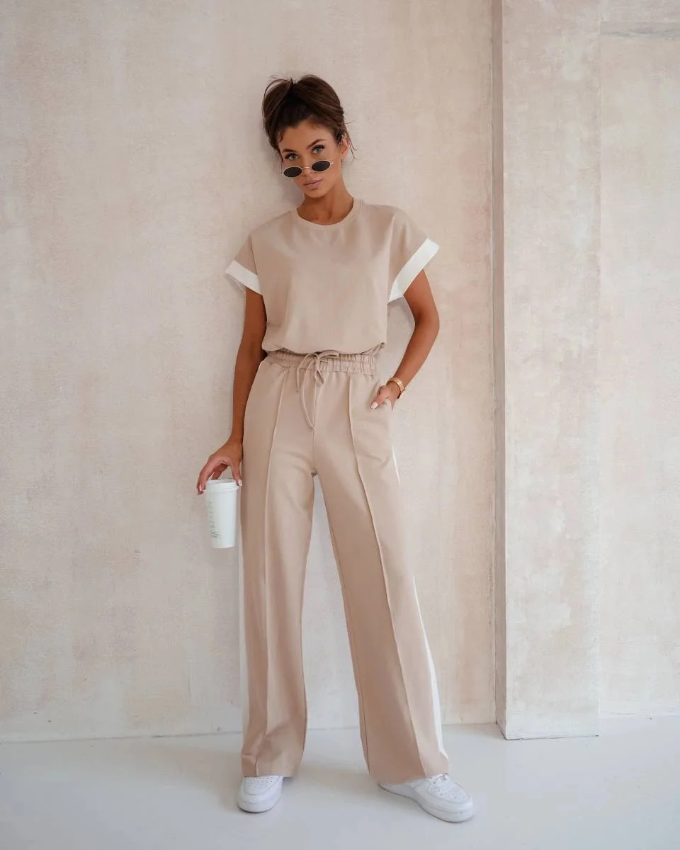 Béžový dámský sportovní komplet s kontrastními vsadkami (VE99)