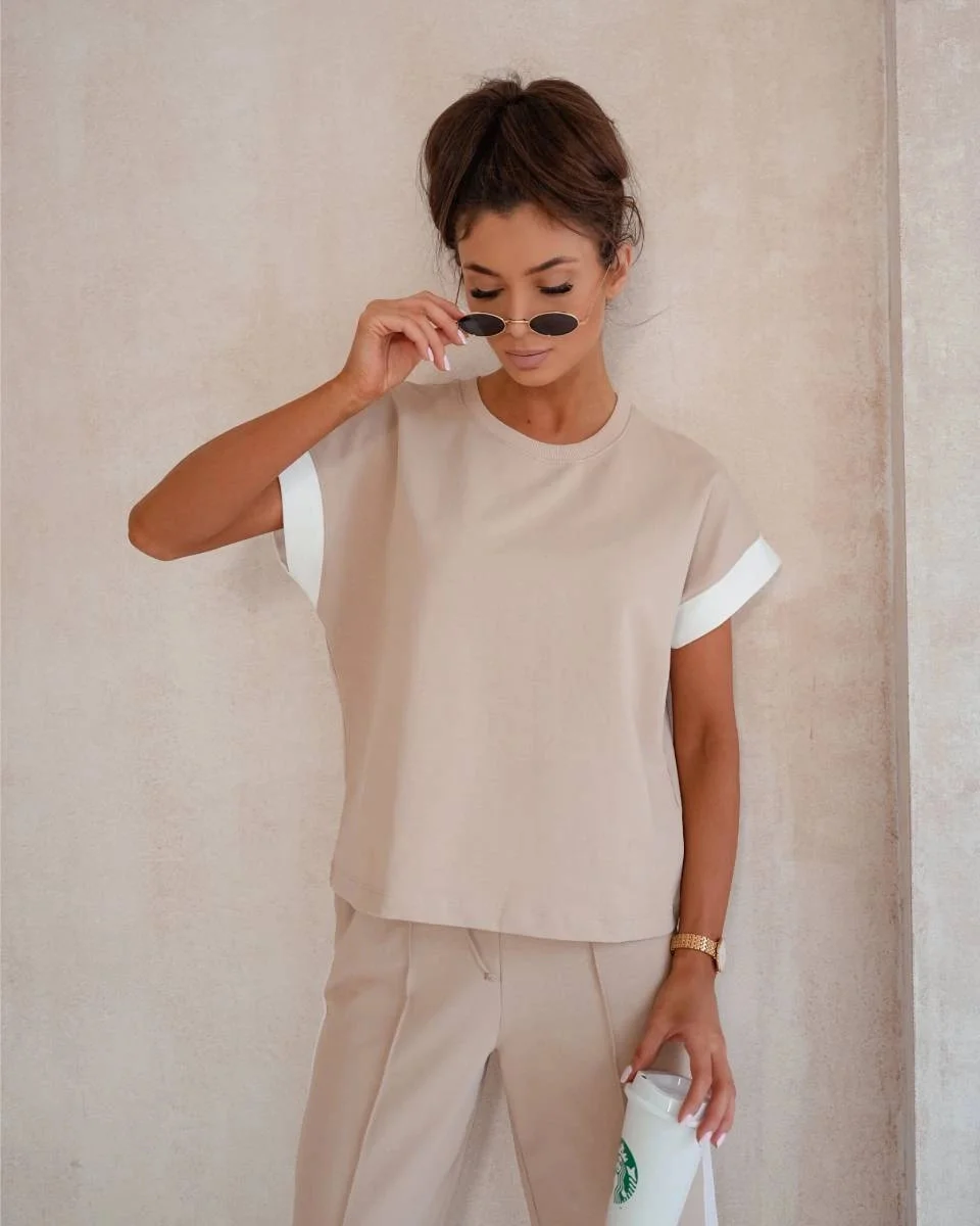 Dámský komplet, který se skládá z volného trička a širokých kalhot.