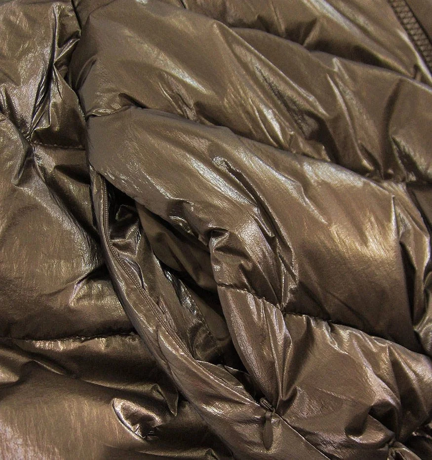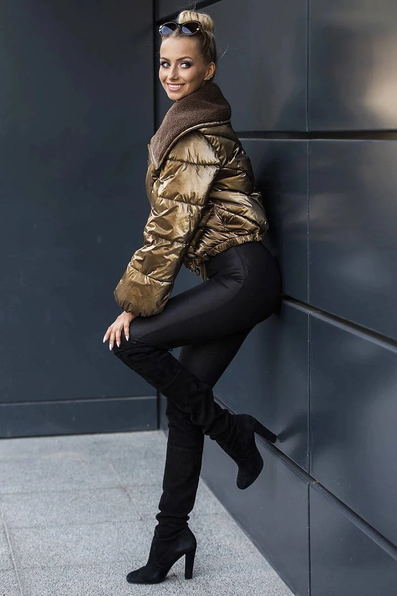 Bunda je lehce lesklá, má volný střih, je zateplená syntetickou péřovou výplní, má dvě kapsy a zapíná se zipem. Stojáček je zateplený beránkem. Na koncích rukávů jsou skryté stahovací lemy. Na spodním okraji modelu je stahující šňůrka. Model má délku do pasu.