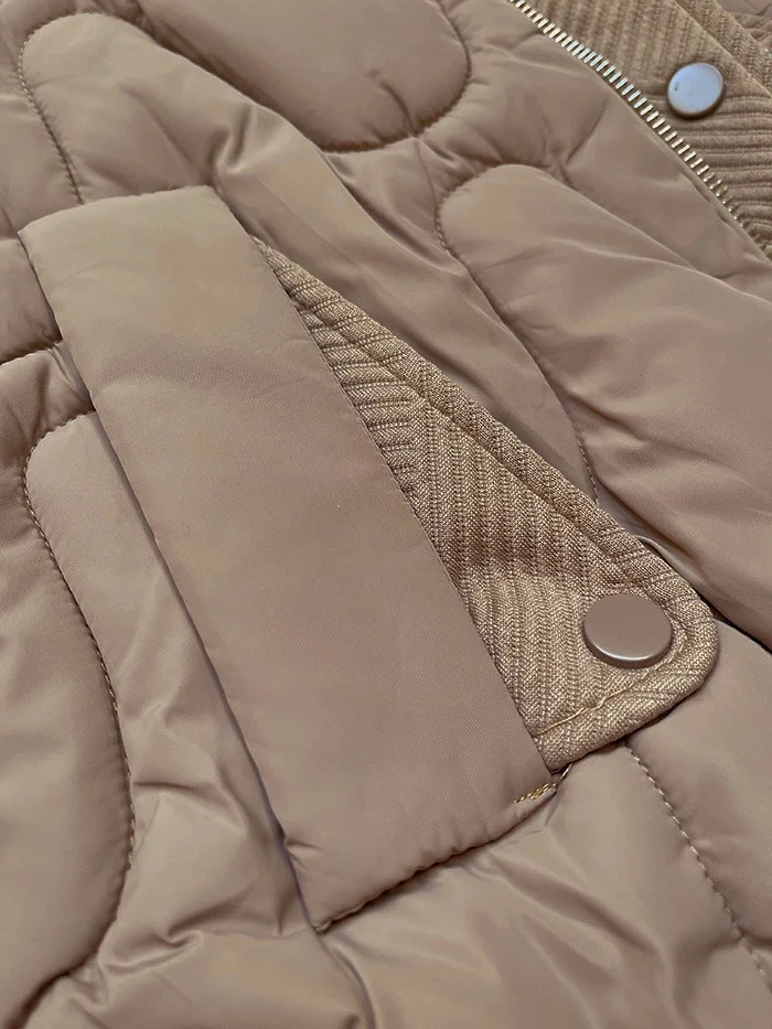 Bunda má volný střih, je zateplená syntetickou péřovou výplní, má dvě kapsy bez zapínání a zapíná se stříbrným zipem. Model má kapuci, kterou není možné odepnout. Na koncích rukávů jsou skryté stahovací lemy. Bunda má délku k bokům.