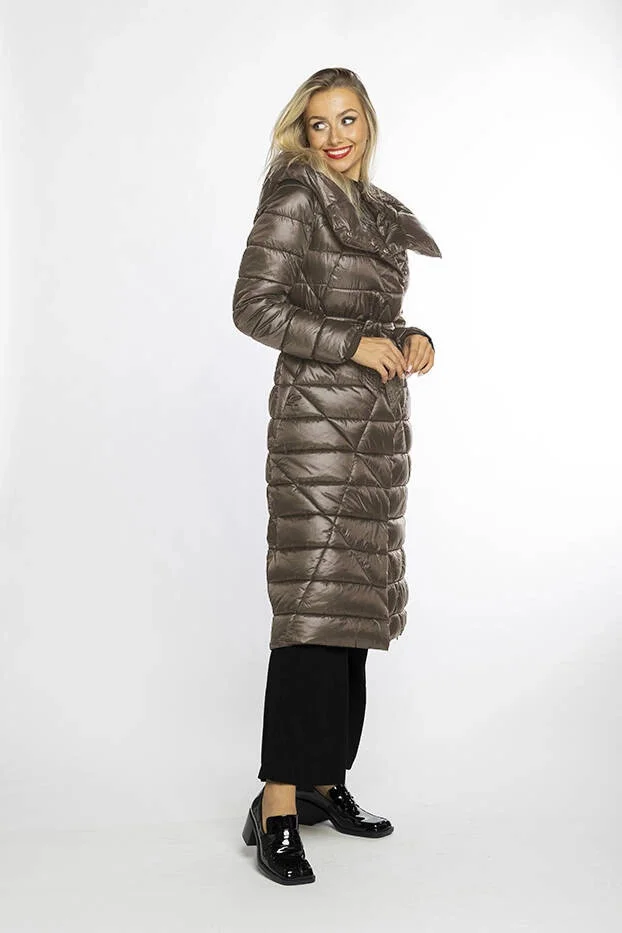 Bunda je lehce vypasovaná, je zateplená vrstvou syntetické péřové výplně, má dvě kapsy a zapíná se šikmým zipem. Model má kapuci, kterou není možné odepnout. Bunda má délku ke kolenům.