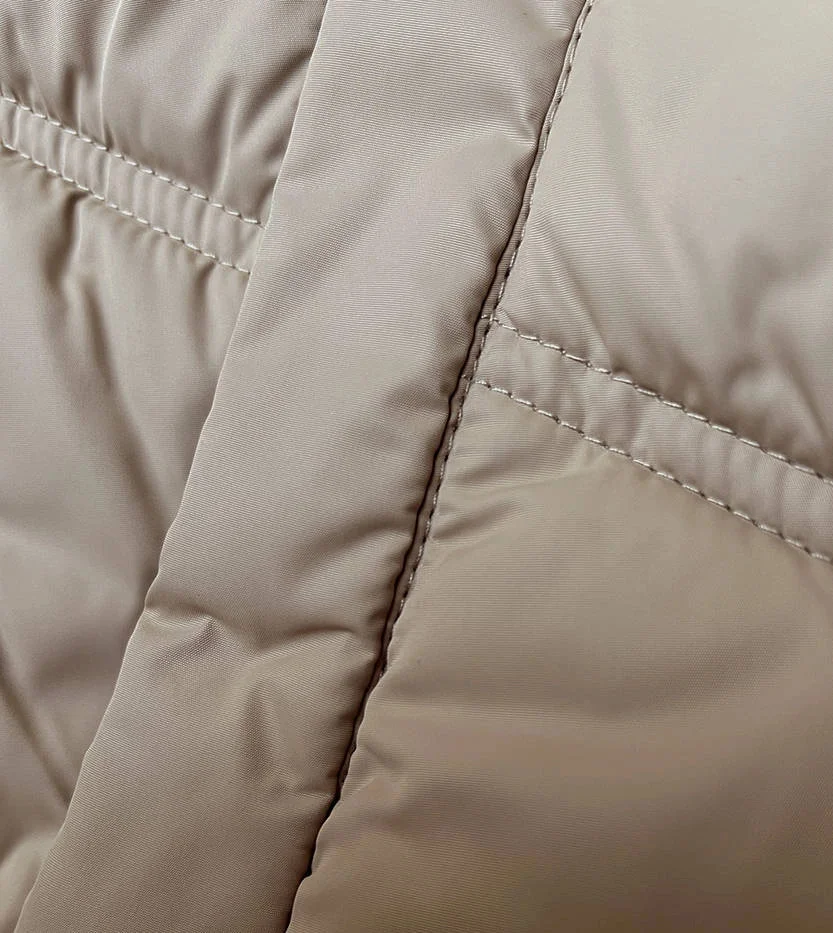 Bunda má volný střih, je zateplená syntetickou péřovou výplní, má dvě kapsy se zapínáním na patentky a zapíná se zipem. Model má stojáček a kapuci, kterou není možné odepnout. Na koncích rukávů jsou skryté stahovací lemy. Bunda má délku k bokům.