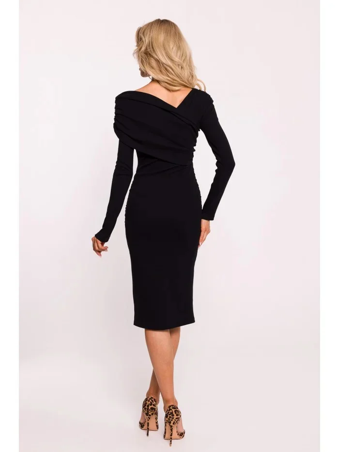 M820 Asymetrické šaty s výstřihem z žebrového úpletu - černé