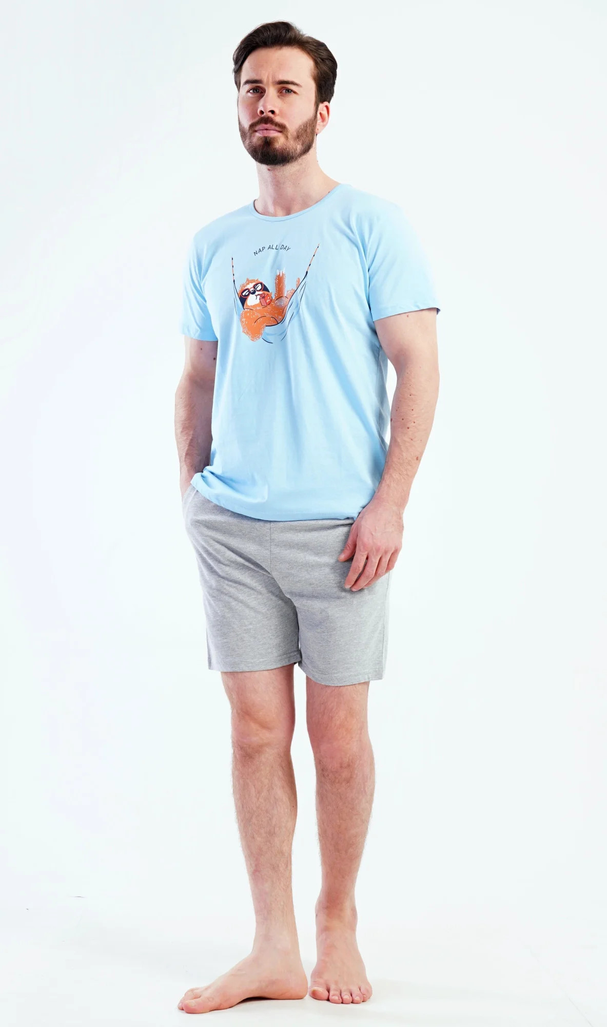 Pánské šortkové pyžamo Pohodář. Pánské pyžamo se skládá z trička s krátkým rukávem a krátkých šortkových kalhot. Na tričku je obrázek lenochoda v houpací síti. Šortky mají kapsy, v pase gumu a šňůrku na stáhnutí. Použitý materiál je příjemný a poddaný na dotek. Obsah bavlny u trička je 100% a u šortek 70%. Pyžamo je vhodné i na denní nošení a oceníte ho obzvlášť v horkých letních dnech.