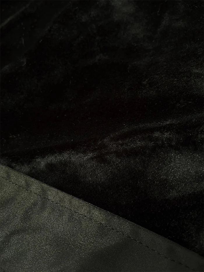 Bunda má kožešinovou podšívku, má dvě kapsy a zapíná se dvojitým zipem a panelem s patentkami. Kapuci lemuje kožešina, kterou je možné odepnout. Rukávy jsou zateplené syntetickou péřovou výplní. Uvnitř rukávů jsou na koncích skryté stahovací lemy. V pase modelu je stahující šňůrka. Bunda má délku nad kolena.