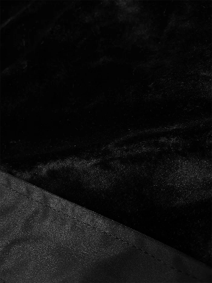 Bunda má kožešinovou podšívku, má dvě kapsy a zapíná se dvojitým zipem a panelem s patentkami. Kapuci lemuje kožešina, kterou je možné odepnout. Rukávy jsou zateplené syntetickou péřovou výplní. Uvnitř rukávů jsou na koncích skryté stahovací lemy. V pase modelu je stahující šňůrka. Bunda má délku nad kolena.
