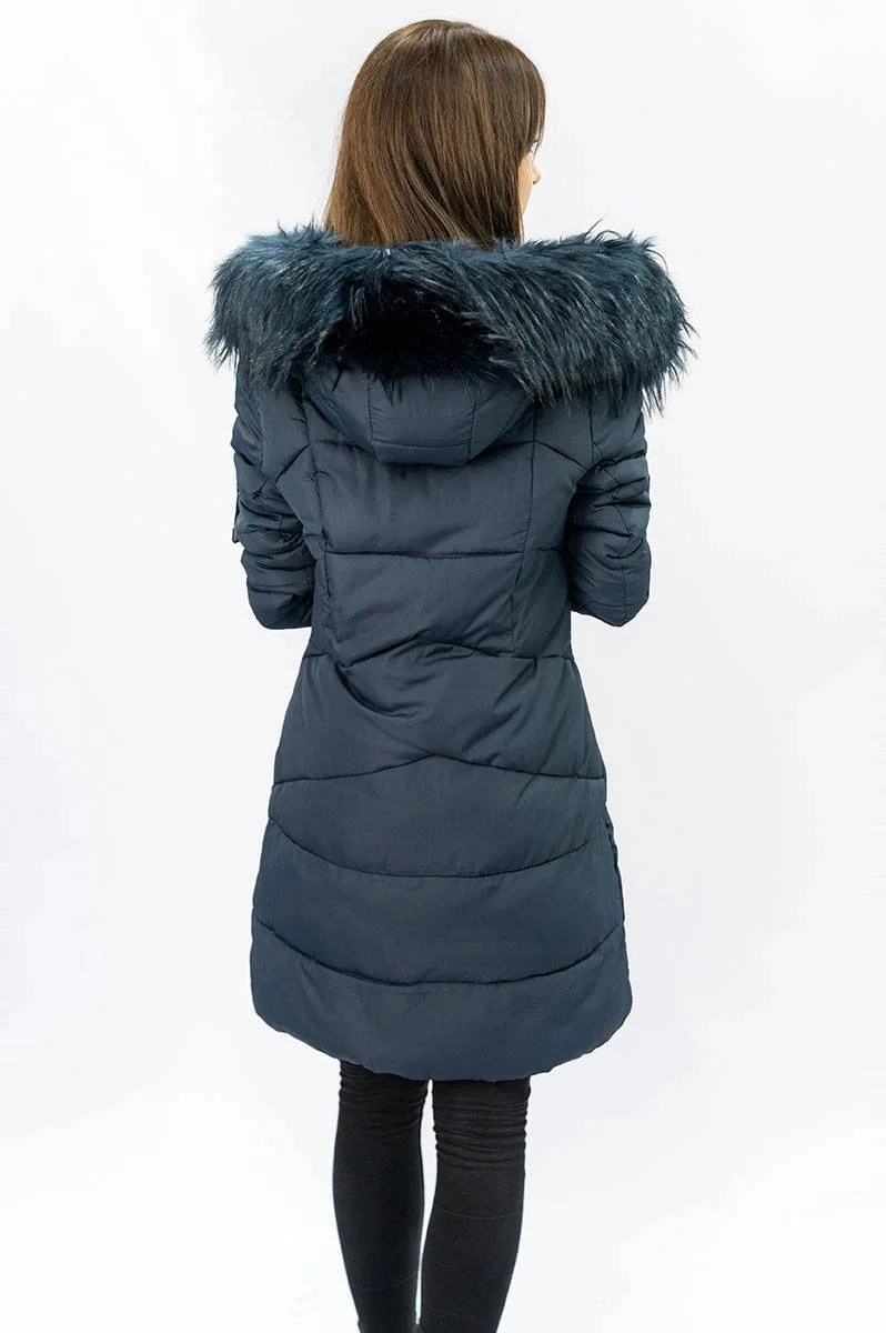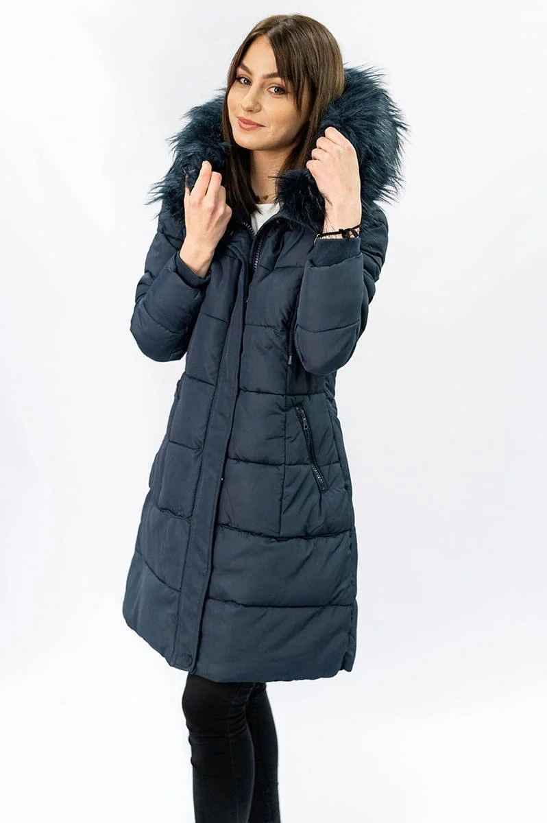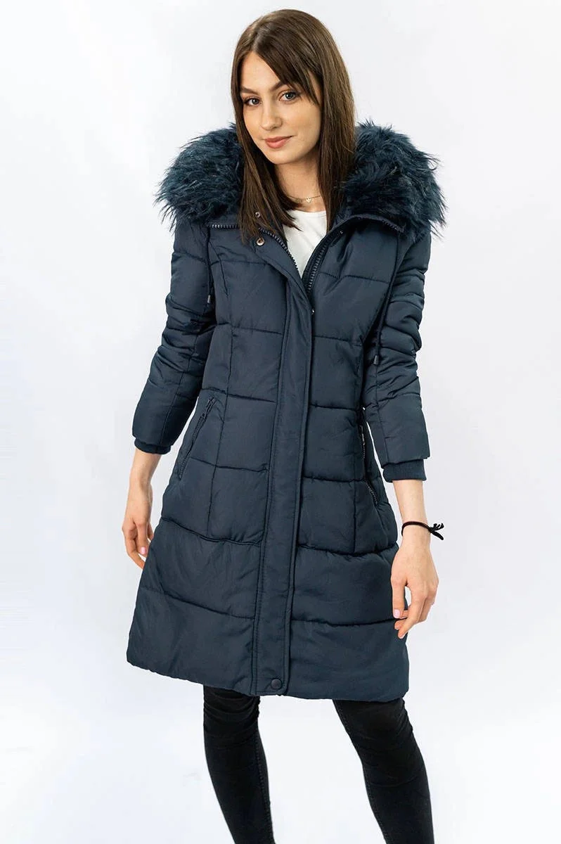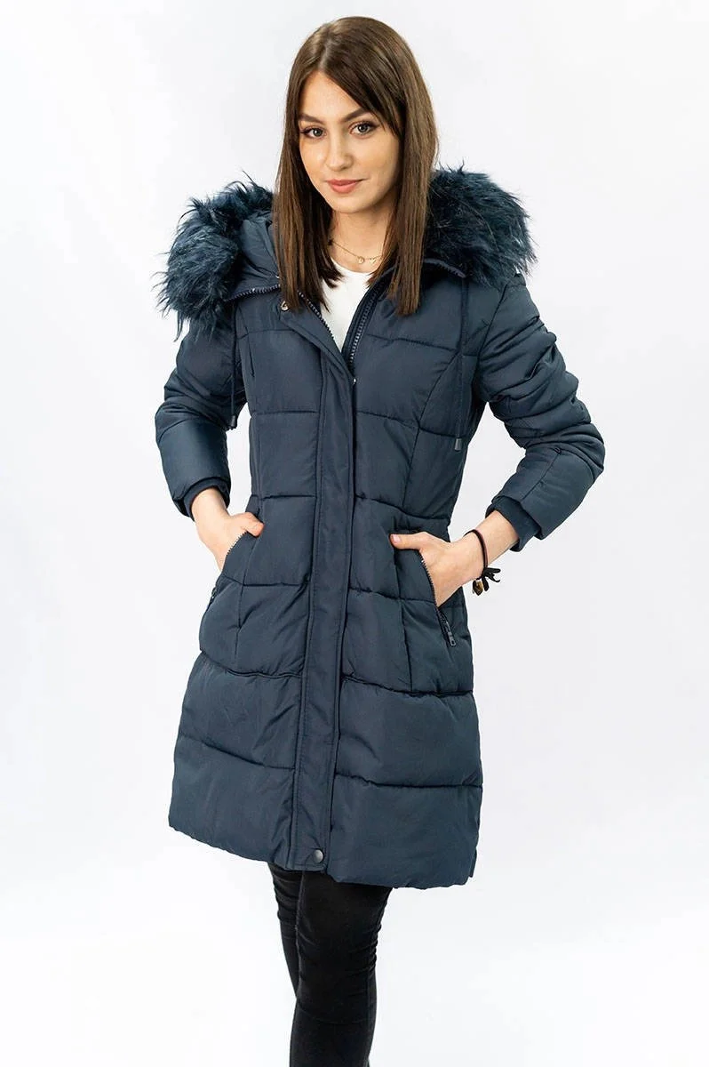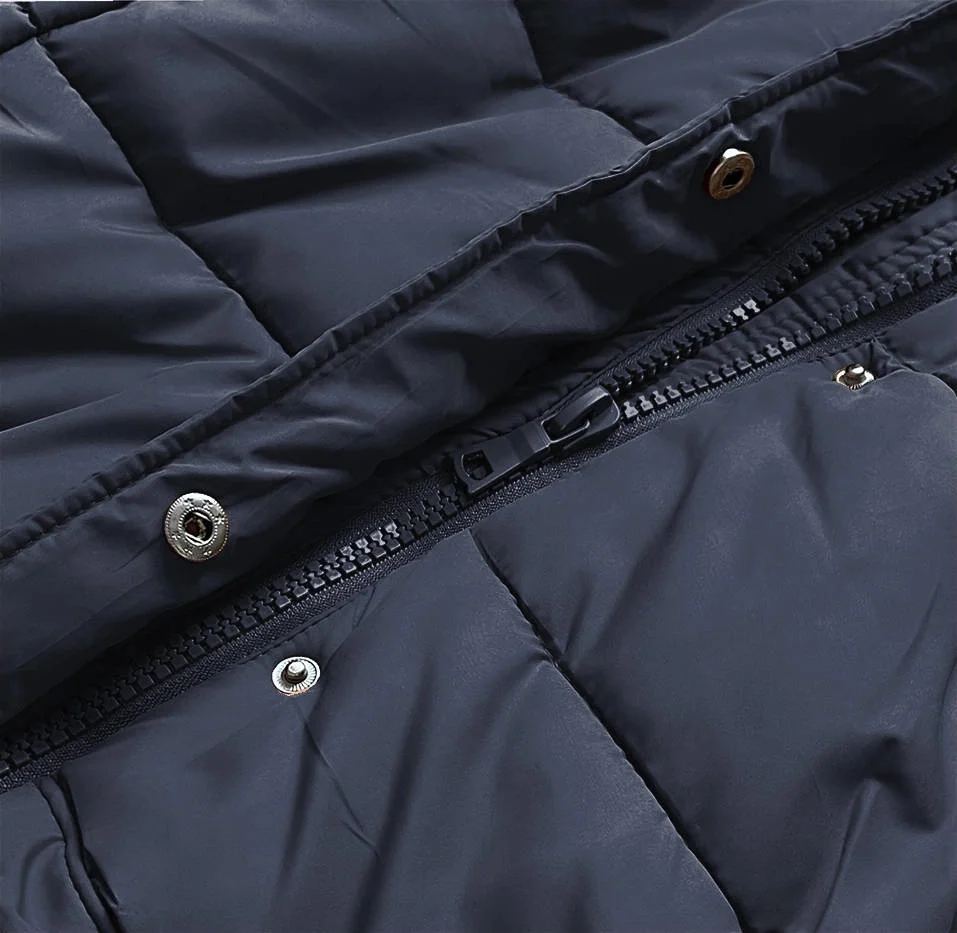 Přidání recenze k Tmavě modrá dámská prošívaná zimní bunda s kapucí (7757)
