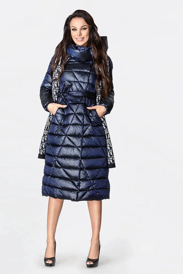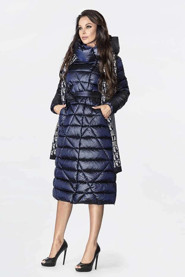Tmavě modrý prošívaný kabát s vysokým stojáčkem a kapucí (j9-069)