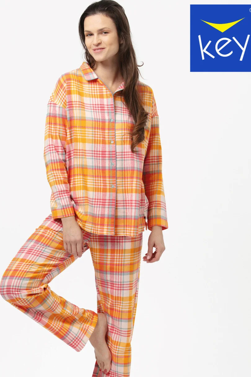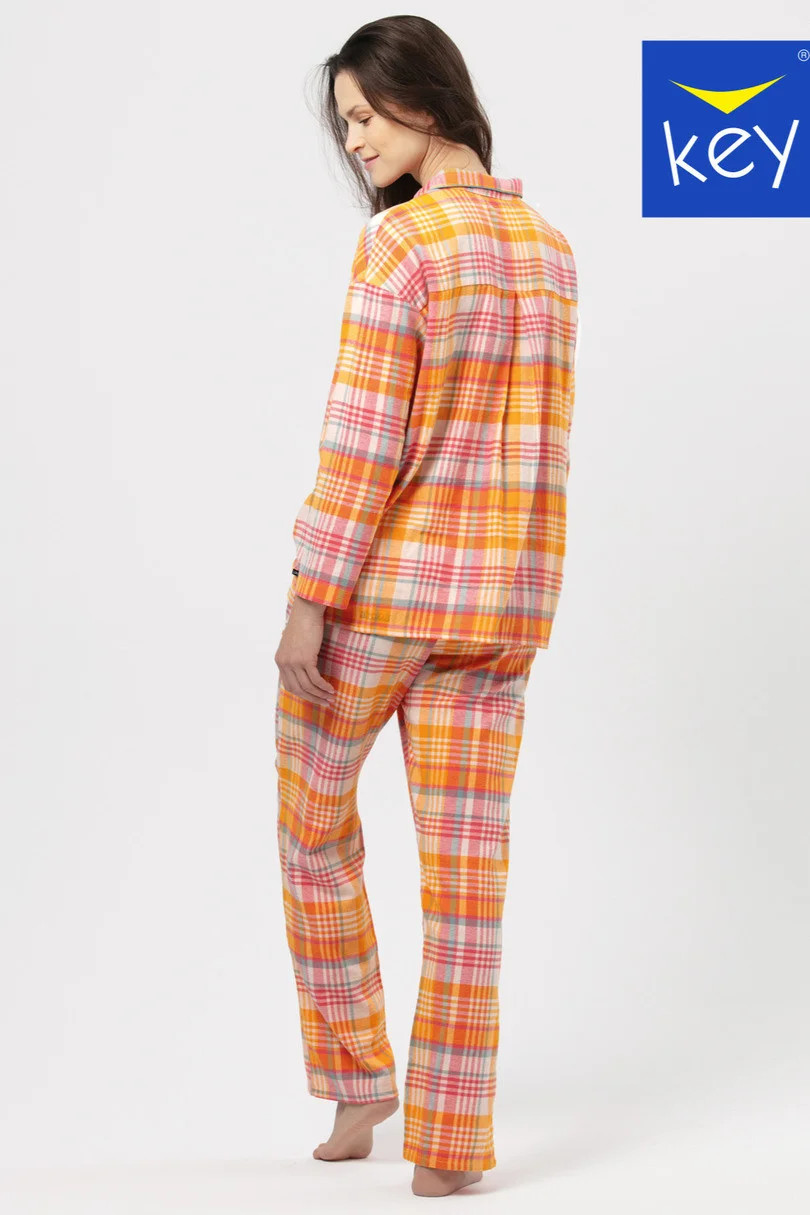 Dámské pyžamo z kostkovaného bavlněného flanelu zdobeného třpytivou nití. Halenka s dlouhými rukávy a otevřeným límcem, dlouhé kalhoty s kapsami, v pase pohodlná guma. Hřejivá a na dotek úžasně příjemná flanelová tkanina ideální pro chladné zimní večery.