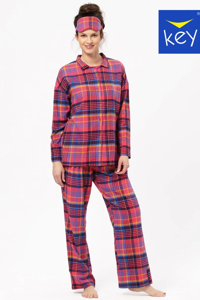 Dámské pyžamo z kostkovaného bavlněného flanelu zdobeného třpytivou nití. Halenka s dlouhými rukávy a otevřeným límcem, dlouhé kalhoty s kapsami, v pase pohodlná guma. Hřejivá a na dotek úžasně příjemná flanelová tkanina zahřeje vaše tělo během chladných podzimních a zimních večerů.