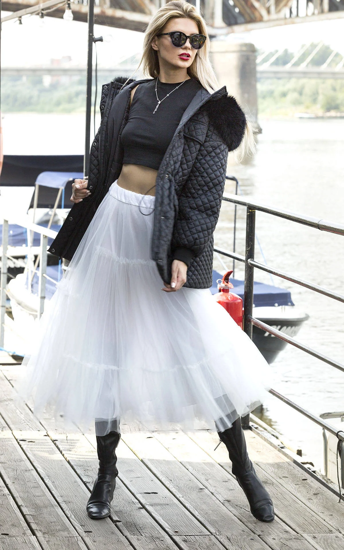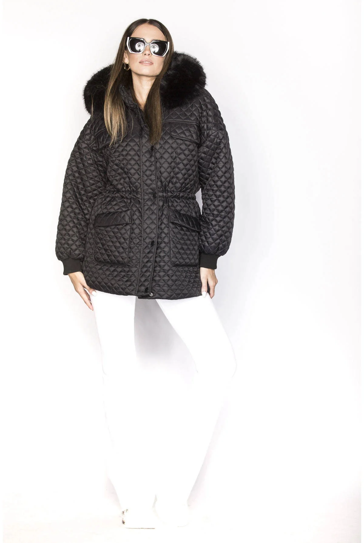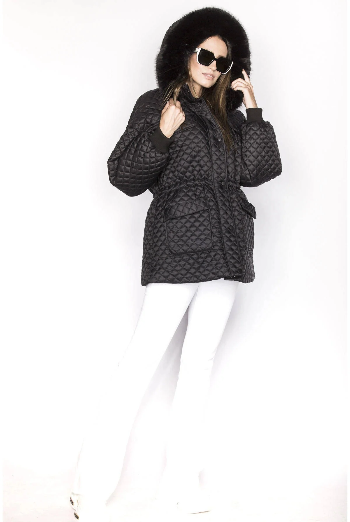 Bunda má volný střih, je lehce zateplená, má dvě kapsy a zapíná se zipem. Kapuce je olemovaná kožešinou, kterou je možné odepnout. Uvnitř modelu jsou v pase stahující gumy. Široké rukávy jsou olemované stahovacími lemy. Model má délku pod boky.