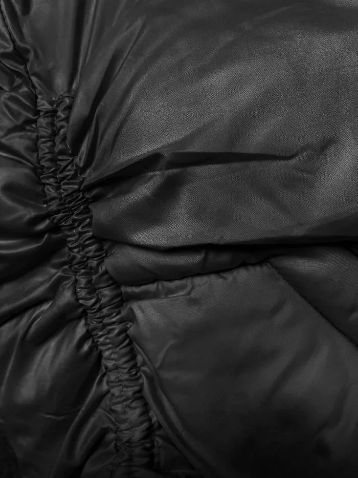 Bunda má dvě kapsy a zapíná se zipem. Model má kapuci, kterou je možné odepnout. Kapuce se zapíná patentkami a táhnou se v ní stahující šňůrky. Na bocích modelu jsou stahující šňůrky. Bunda má délku k bokům.