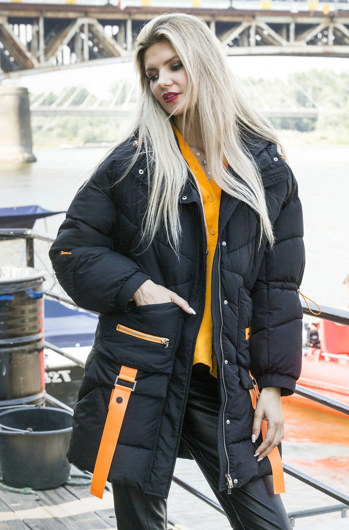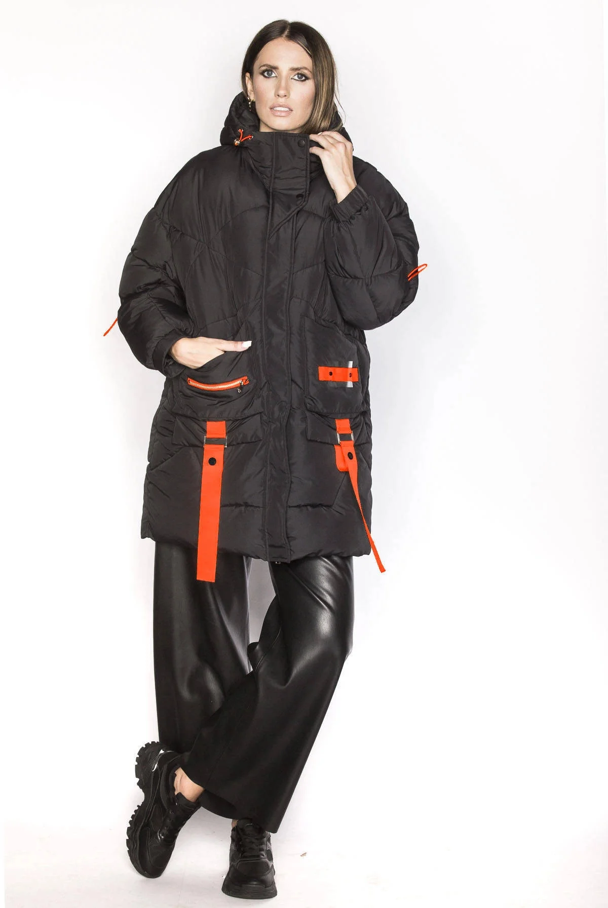 Bunda má střih typu oversize, má dvě kapsy a zapíná se dvousměrným zipem a panelem s patentkami. Model má kapuci, kterou není možné odepnout. Široké rukávy jsou olemované gumou. Bunda má délku do poloviny stehen.