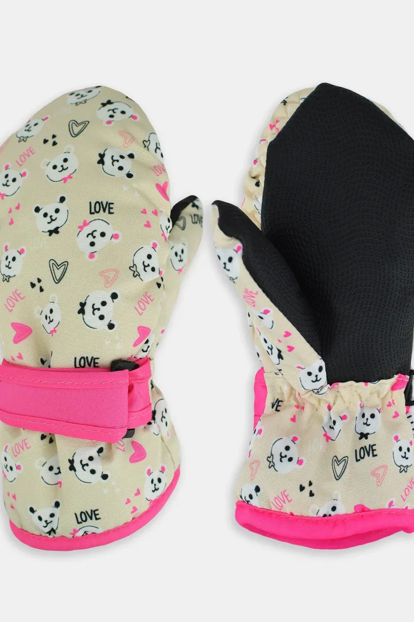 Zateplené dívčí rukavice s potiskem a jedním prstem z ortalu. Rukavice zakončené manžetou s páskem pro nastavení šířky - dobře drží na rukojetích, chrání před sněhem.