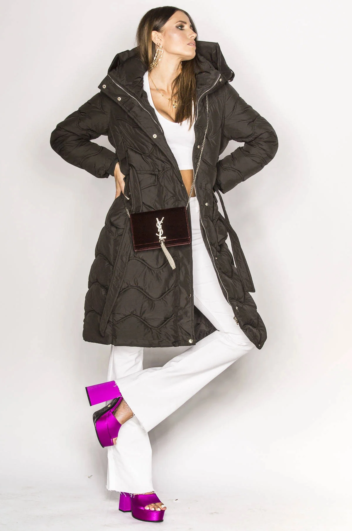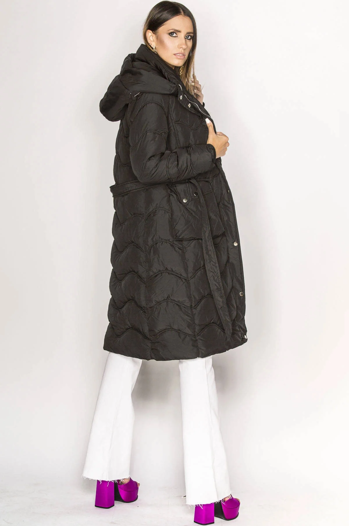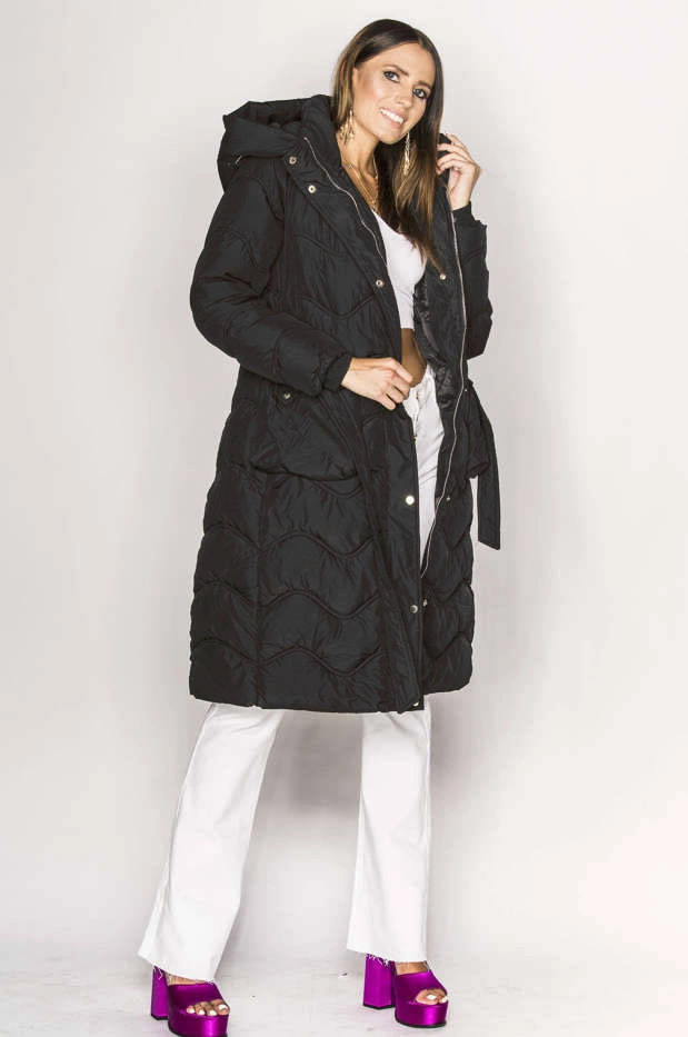 Bunda je vypasovaná, je prošívaná a je zateplená syntetickou péřovou výplní. Model má pásek pro zavazování a dvě kapsy. Bunda má délku nad kolena a směrem dolů se rozšiřuje.