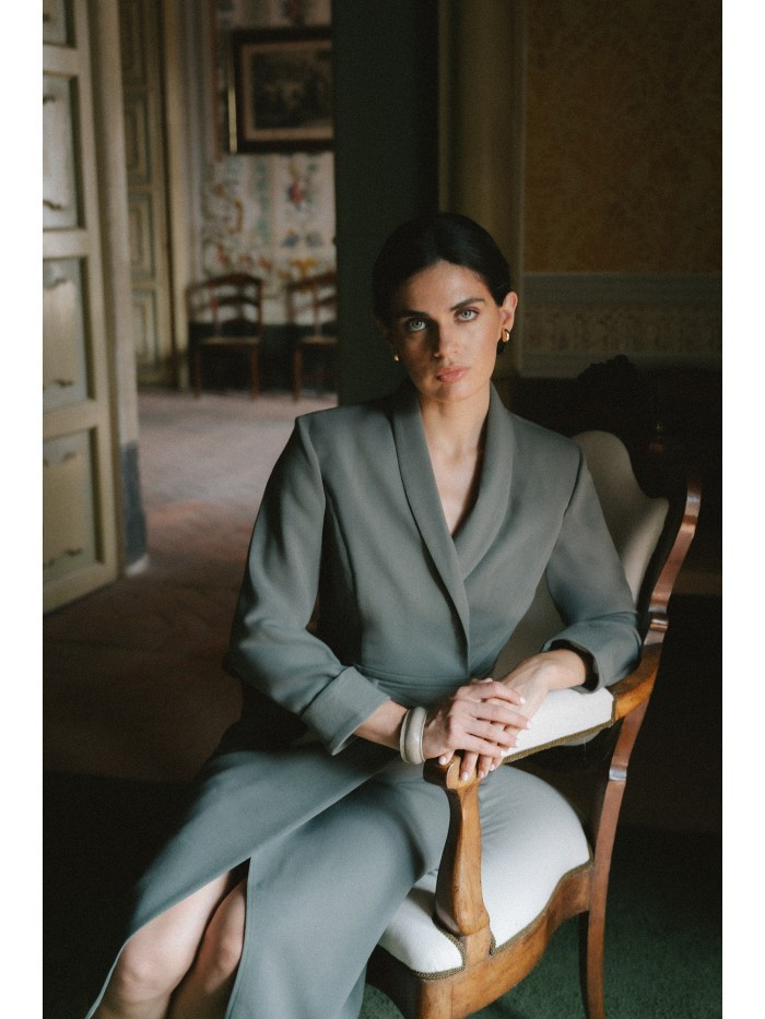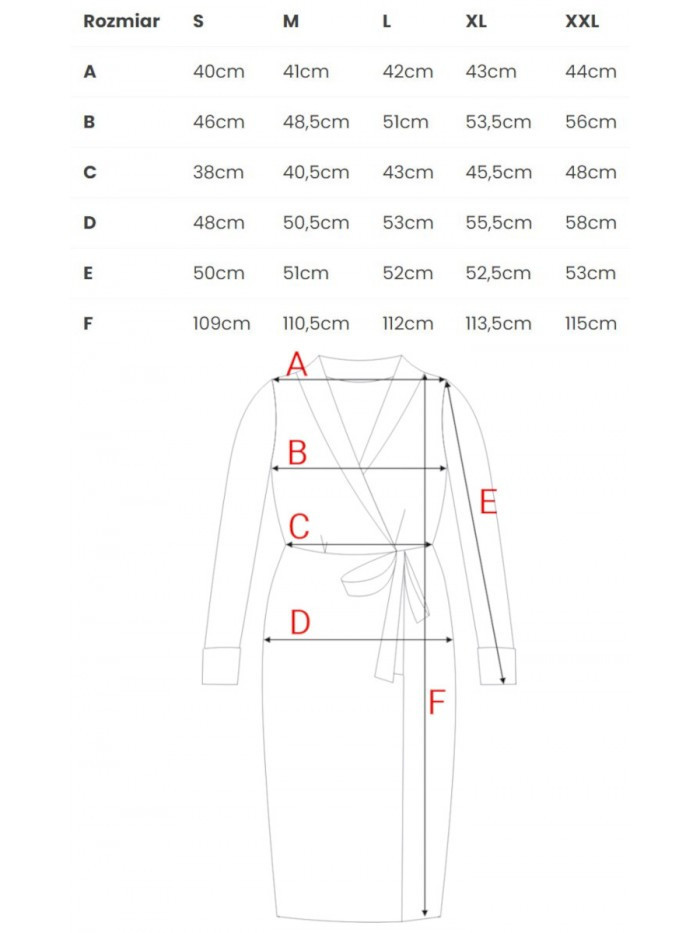 HLAVNÍ LÁTKA 63% polyester 33% wiskoza 4% elastan PODŠÍVKA 95% polyester 5% elastan LÁTKA: hladká tkaná látka s jemným povrchem PODROBNOSTI O PRODUKTU Výstřih: zavinovací výstřih do V Límec: šálový límec Rukávy: 7/8 délky s ohrnutými manžetami Pas: zvýrazněný páskem Zapínání: zavazování v pase Kapsy: žádné Podšívka: částečně podšitá Model: S415 Navrženo a vyrobeno v Polsku Modelka je vysoká 174 cm a nosí velikost S STYL A STŘIH Styl: zavinovací šaty Tvar: vypasovaný vršek, rovná sukně s mírným uvolněním Délka: pod kolena