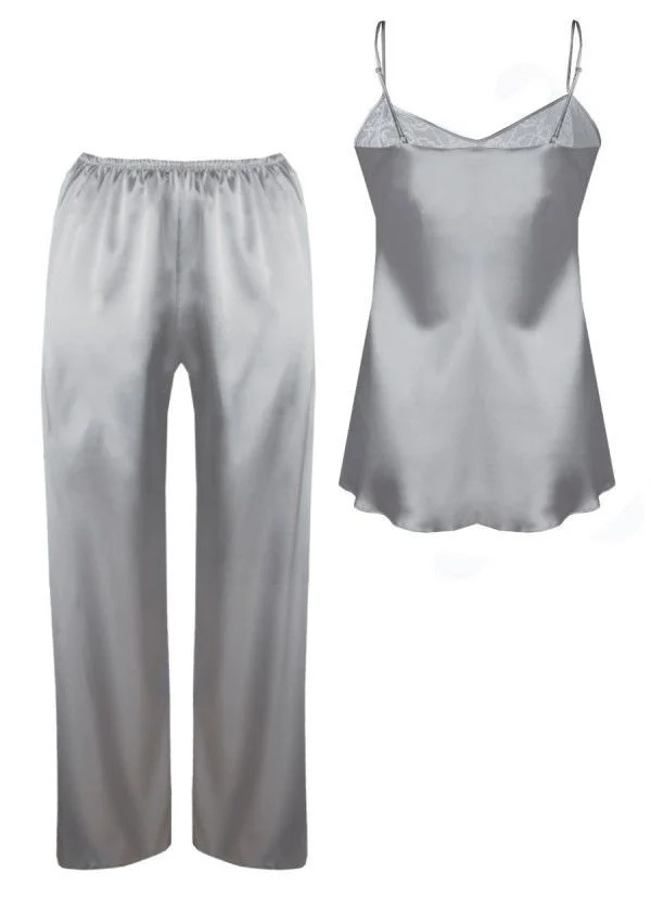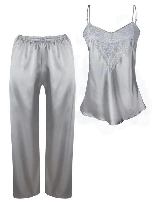 Začněte večer něčím výjimečným! Měkký, vysoce kvalitní satén s jemným, perleťovým leskem bude vypadat vznešeně na lehce opálené pokožce, zatímco bílá, okouzlující krajka okamžitě zdůrazní vaši ženskost. Souprava obsahuje halenku s tenkými, nastavitelnými ramínky a dlouhé kalhoty s měkkou gumičkou. 100% polyester.