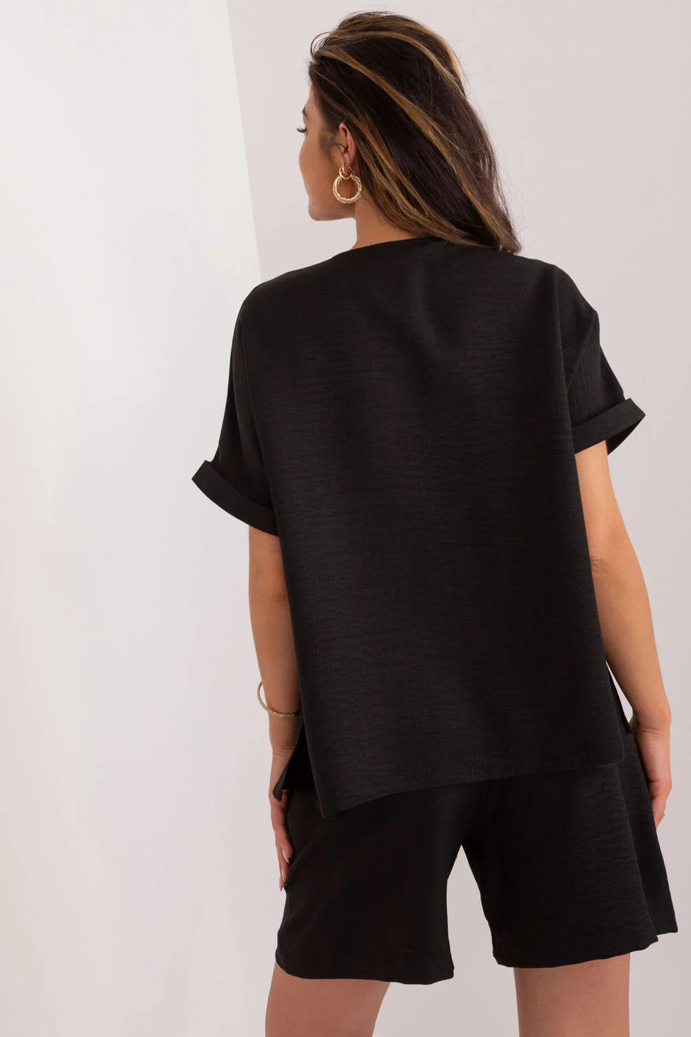 Tato elegantní a zároveň ležérní dámská souprava se skládá z trička a šortek a je ideální na každodenní vycházky. Hladký design a kombinace bavlny a polyesteru zajišťují pohodlí a trvanlivost. Šortky v délce ke kolenům se širokými nohavicemi a vysokým pasem zvýrazňují siluetu, zatímco boční kapsy dodávají praktičnost. Krátké rukávy a výstřih do V dodávají košili lehkost a letní styl, zatímco knoflíky na přední straně umožňují snadné oblékání. Jedná se o ideální volbu pro teplé dny, která kombinuje pohodlí a módní vzhled.