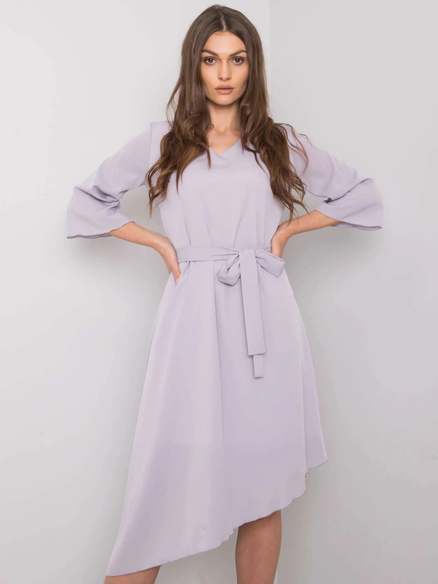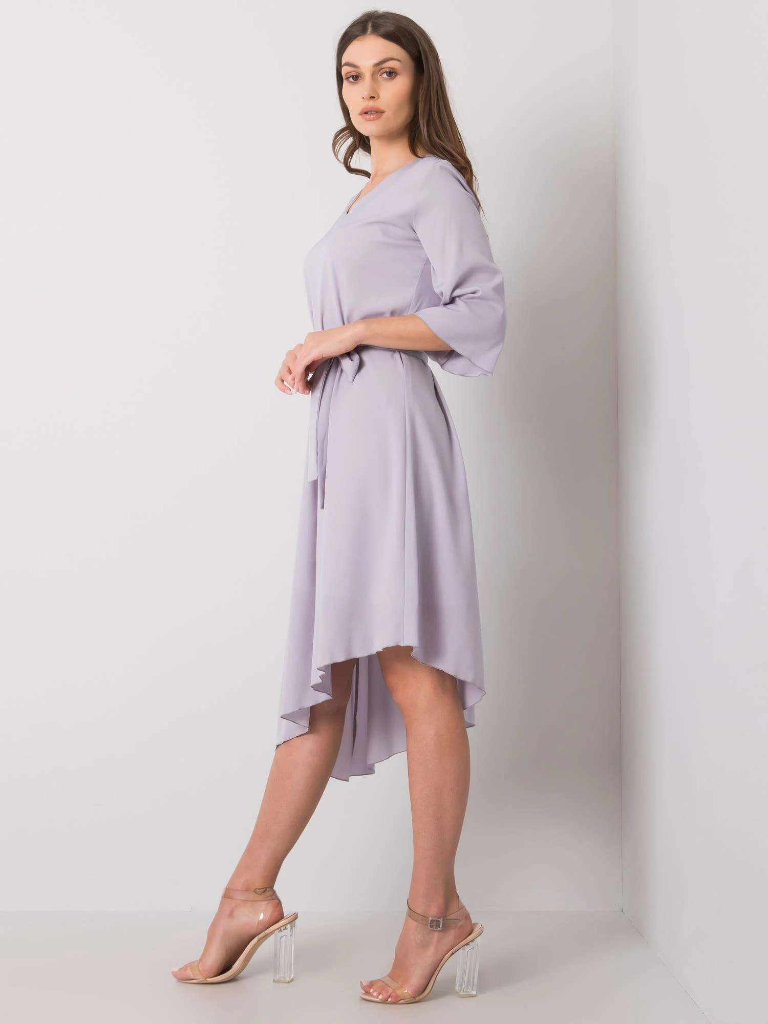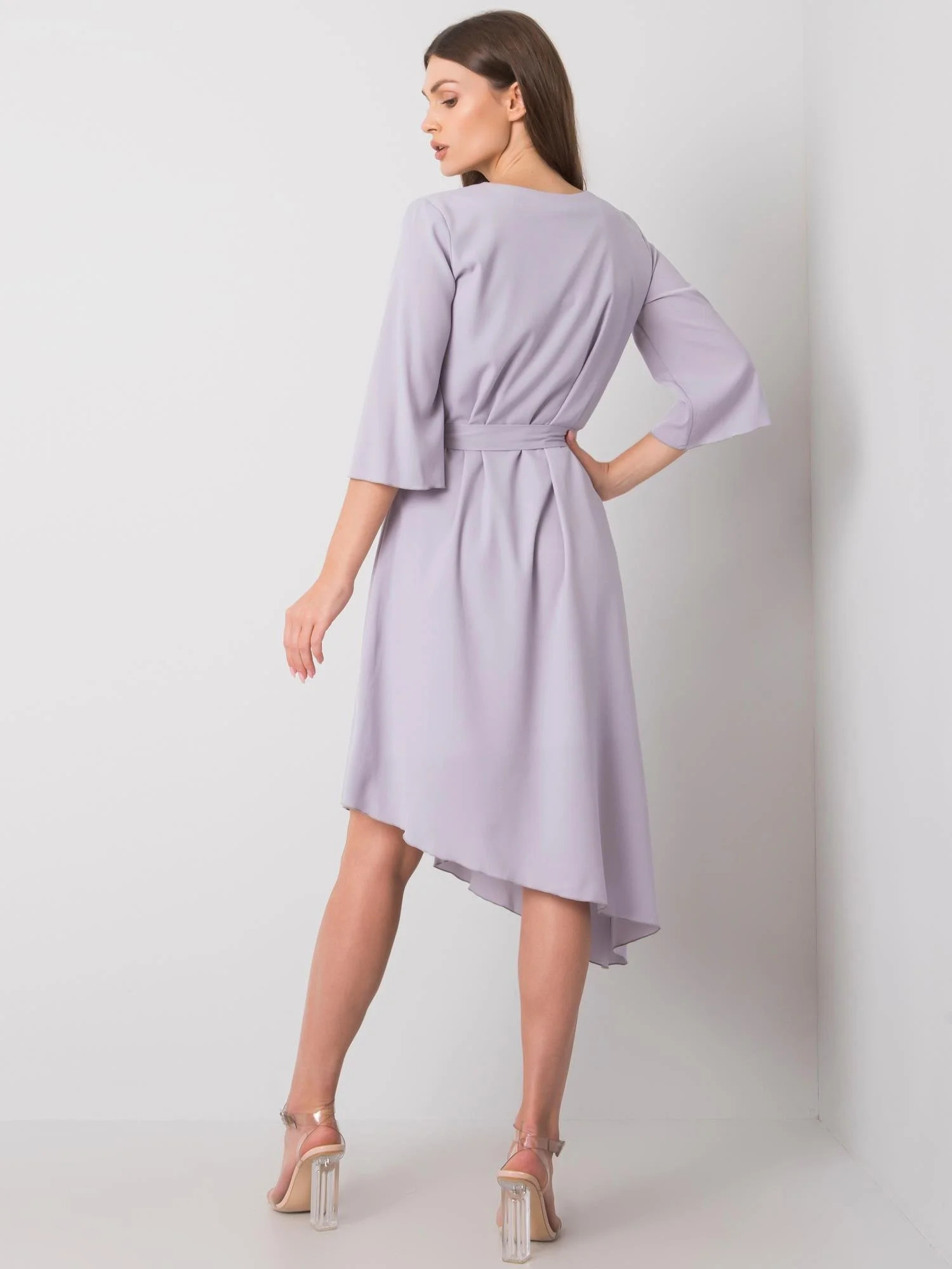 M820 Asymetrické šaty z žebrového úpletu s výstřihem - šedý melír