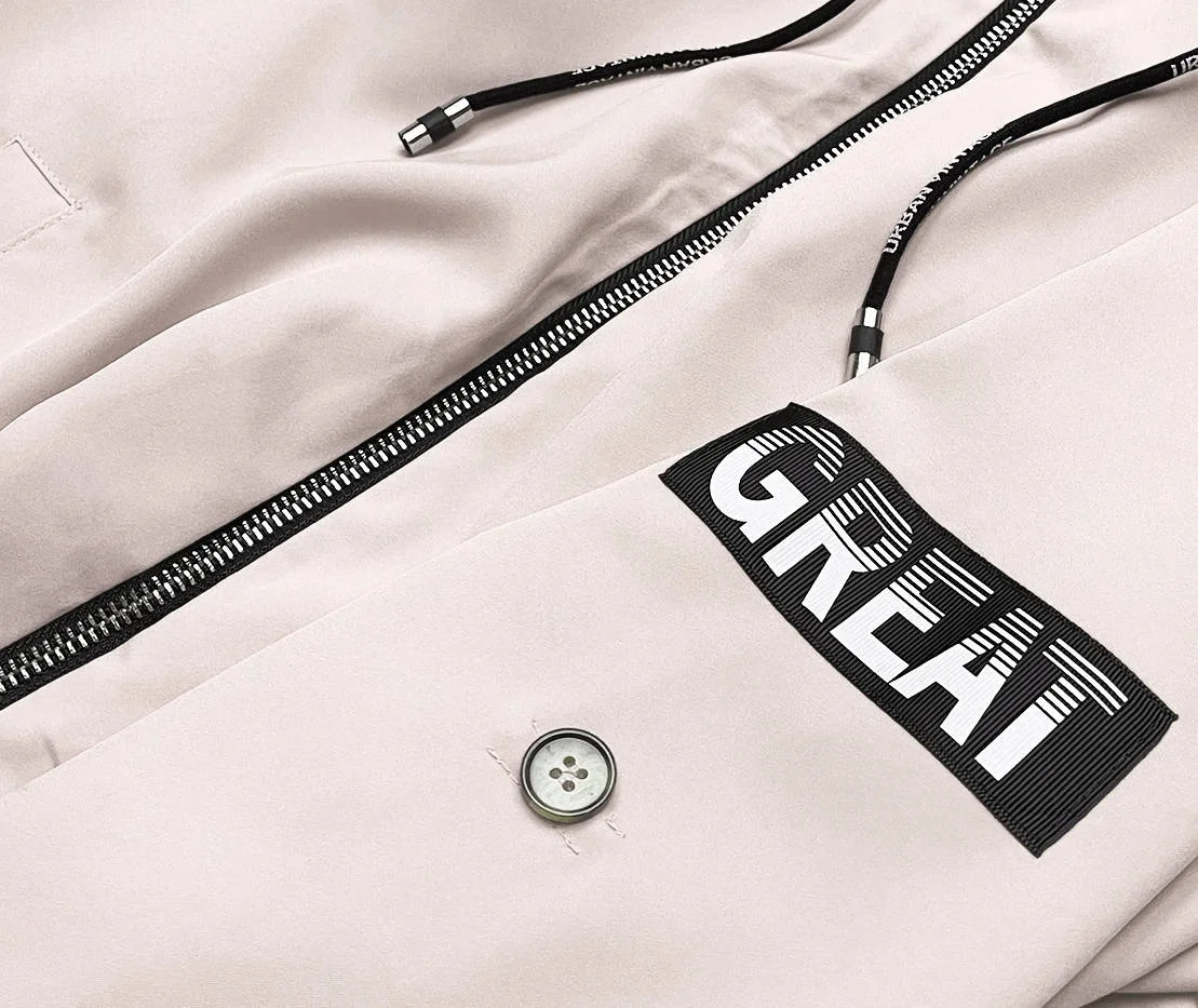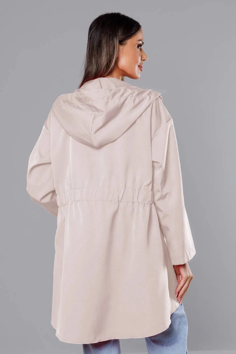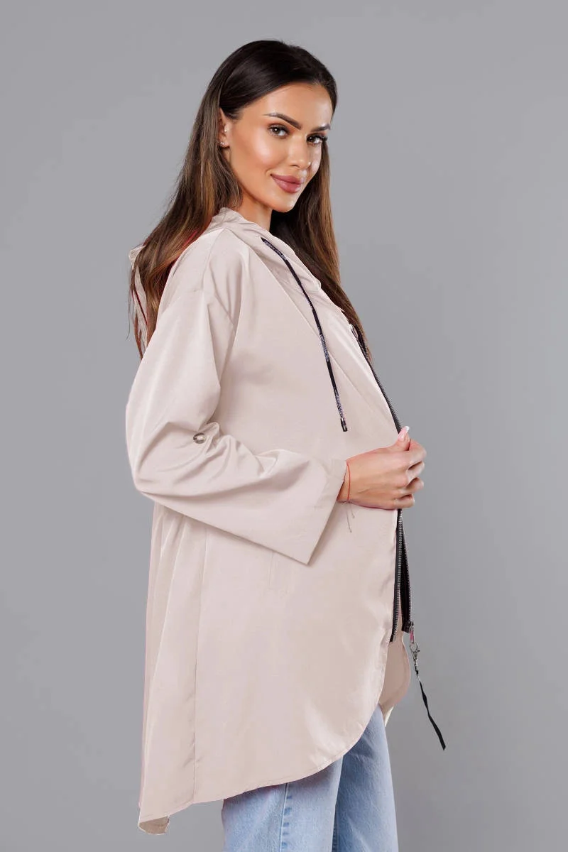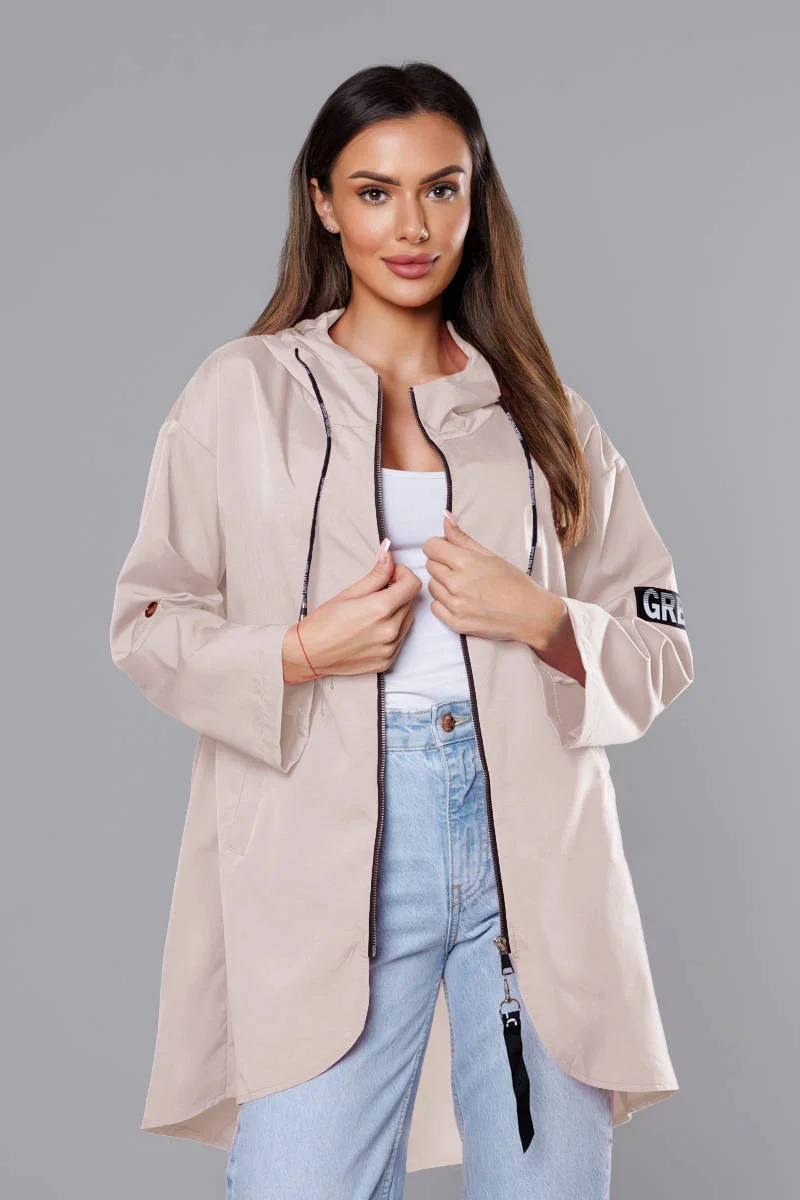 Přehoz se zapíná zipem a má dvě kapsy bez zapínání. Vzadu je v pase guma. Rukávy je možné ohrnout. Přední část modelu má délku k bokům a zadní část má délku do poloviny stehen.