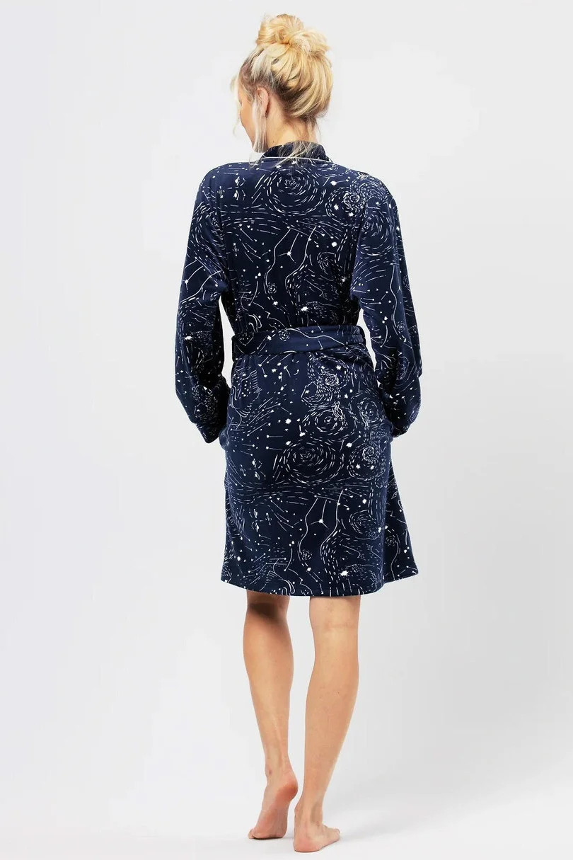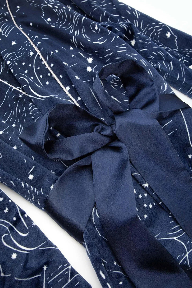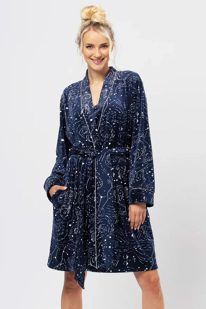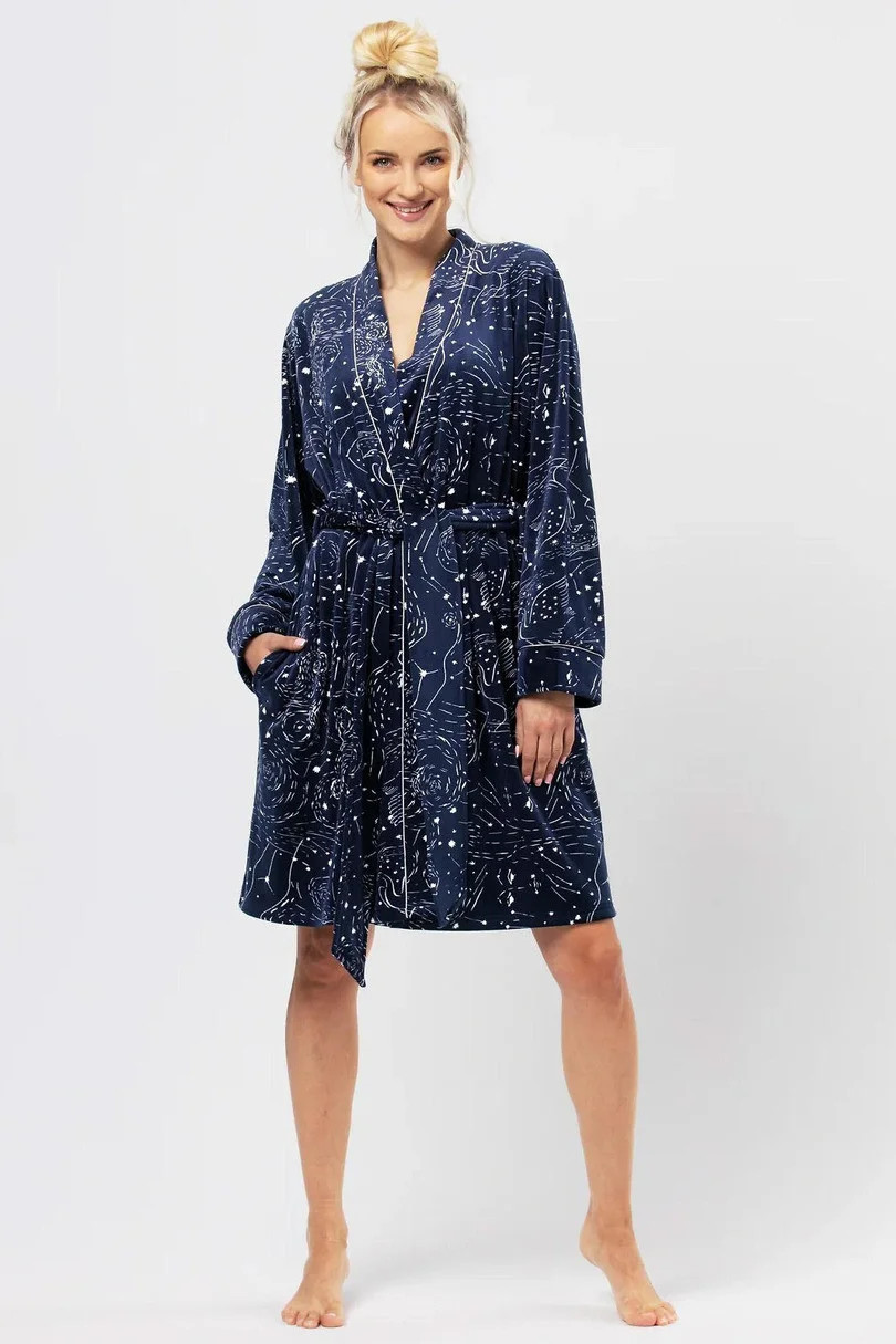 Krátký dámský župan s hvězdnou oblohou - na dotek mimořádně příjemný ženský župan v délce ke kolenům. Je vyroben z mírně elastického úpletu s elastanem, který obepíná tělo a zdůrazňuje přednosti ženské siluety. Jeho střih neomezuje v pohybu, je pohodlný a zároveň velmi praktický - má hluboké boční kapsy a široký pásek. Všité manžety ve spodní části rukávů lze rychle a snadno ohrnout - aby nepřekážely při vaření ranní kávy! Velmi ženský župan, plný šarmu a elegance - ideální pro chvíle odpočinku a radosti doma!