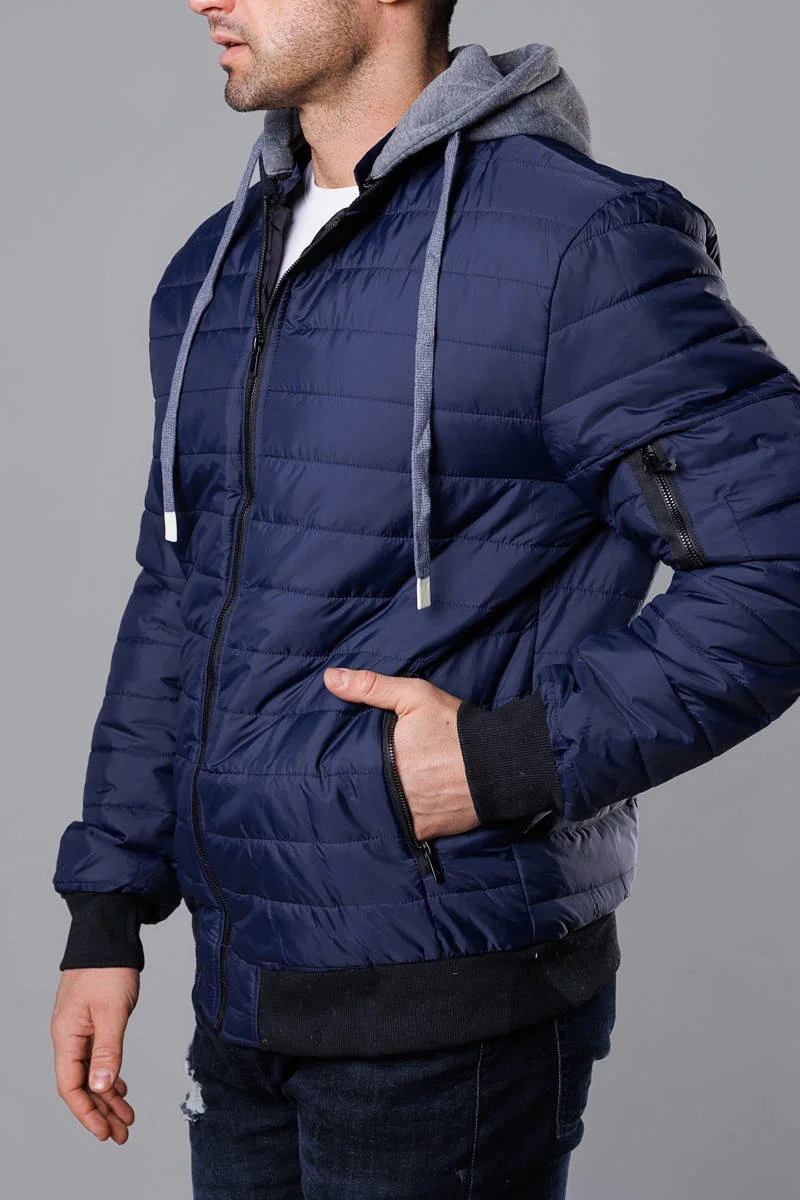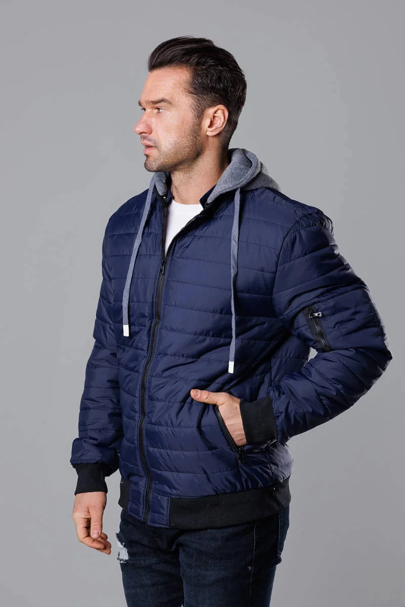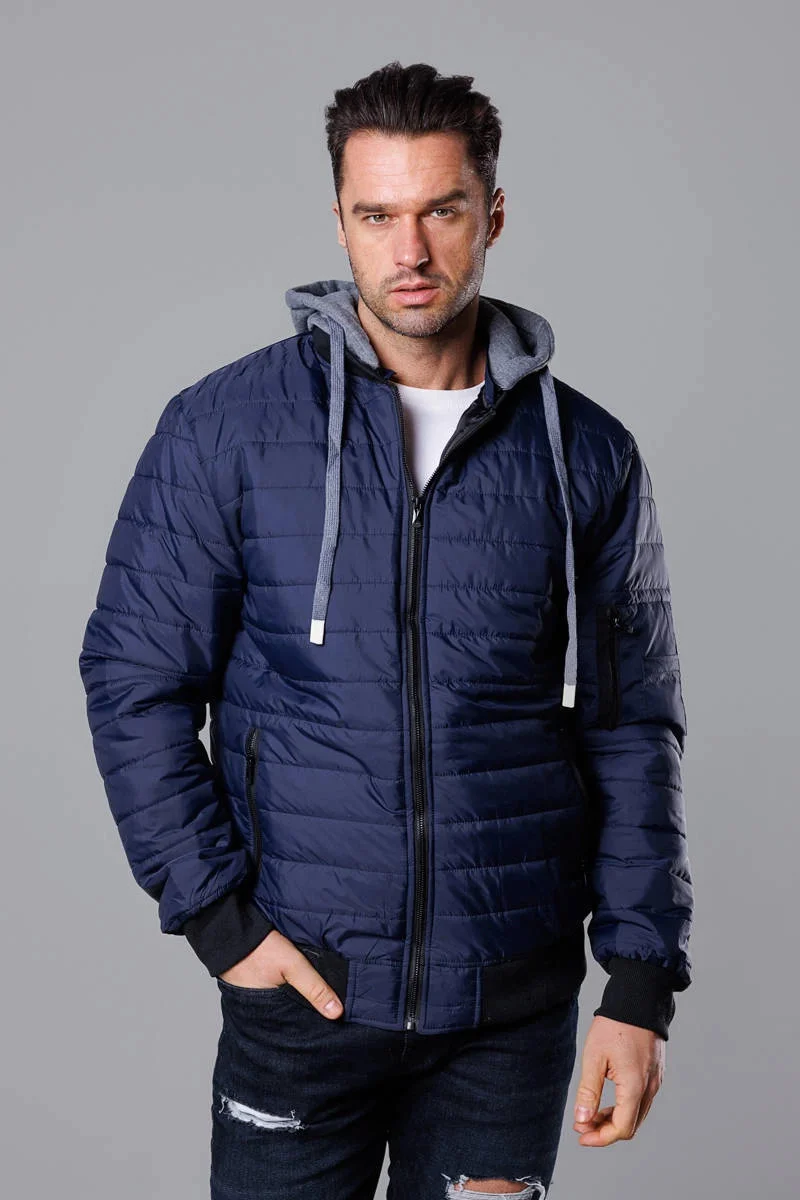 Přidání recenze k Tmavě modrá pánská bunda typu "bomber" s teplákovou kapucí (8M985-215)