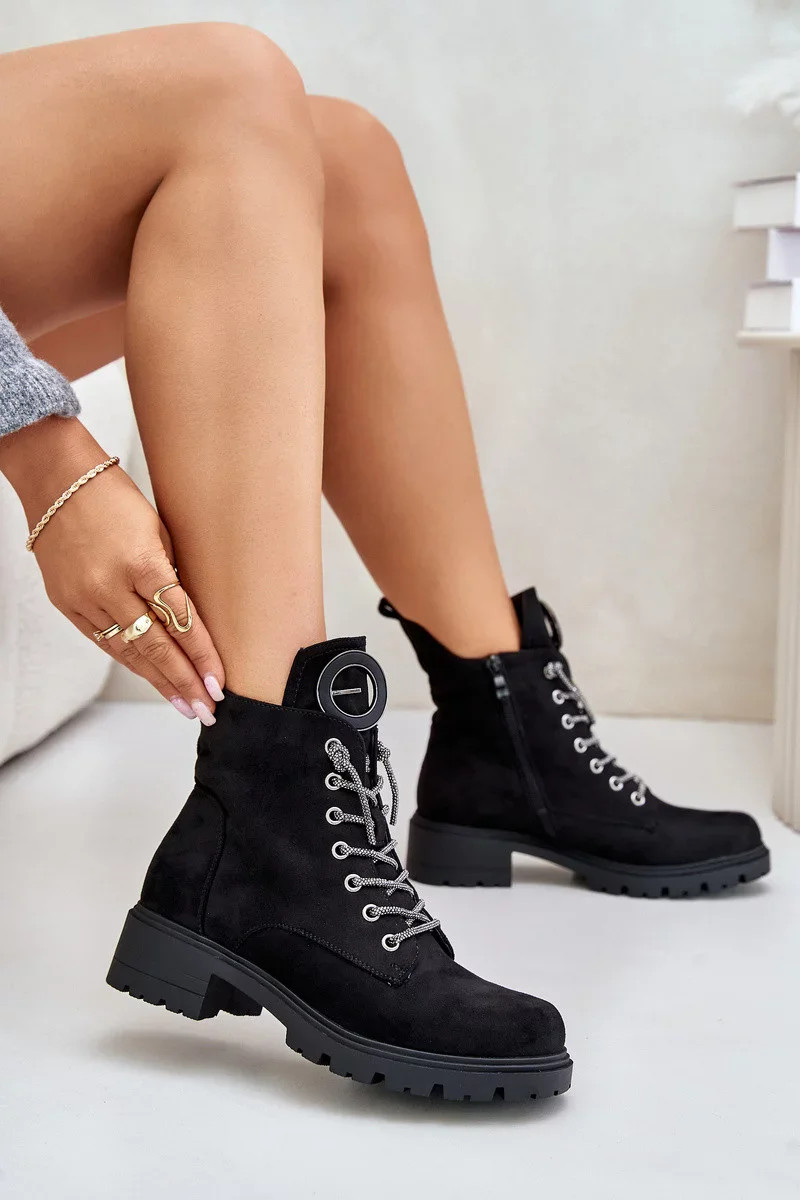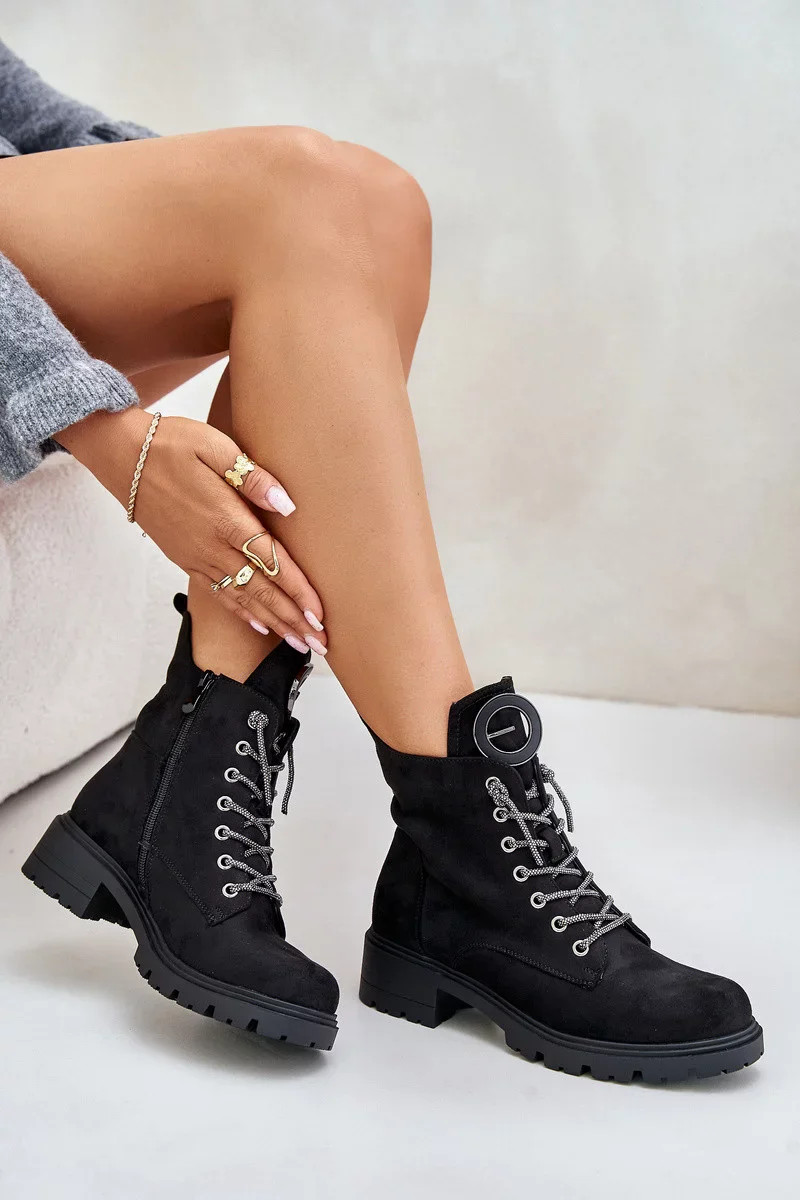 Dámské kotníkové boty z eko semiše jsou kombinací stylu a pohodlí, ideální na chladnější dny. Model je zateplený, což zajišťuje teplo, a zapínání na zip usnadňuje rychlé oblékání. Ozdobné šněrování dodává jedinečný charakter a plochý podpatek zaručuje pohodlí při nošení po celý den. Ozdoba na jazyku představuje jemný akcent, který zdůrazňuje jejich módní design. Ideální pro každodenní stylizace. Při výběru velikosti se prosím řiďte tabulkou velikostí.