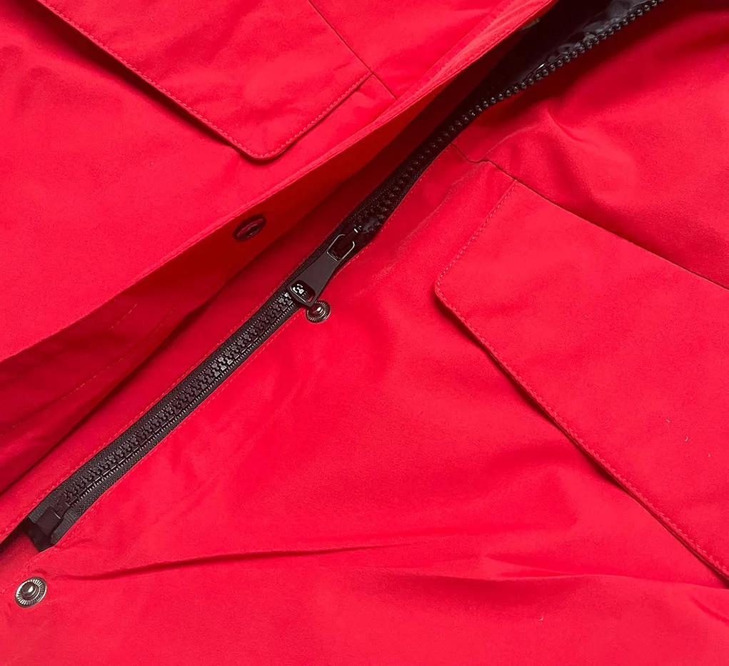 Bunda je lehce vypasovaná, má čtyři kapsy a zapíná se zipem a panelem s patentkami. Model má kapuci olemovanou kožešinou. Zatímco kapuci není možné odepnout, kožešinu odepnout lze. Na koncích rukávů jsou zužující pásky a uvnitř rukávů jsou stahovací lemy. Bunda má délku k bokům.