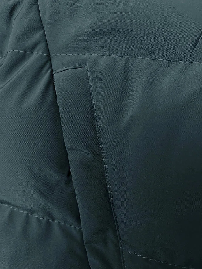 Bunda je lehce vypasovaná, je zateplená syntetickou péřovou výplní, má kožešinovou podšívku, dvě kapsy se zapínáním na zip a zapíná se zipem. Model má kapuci, kterou není možné odepnout. Na koncích rukávů jsou skryté stahovací lemy. Bunda má délku pod boky.