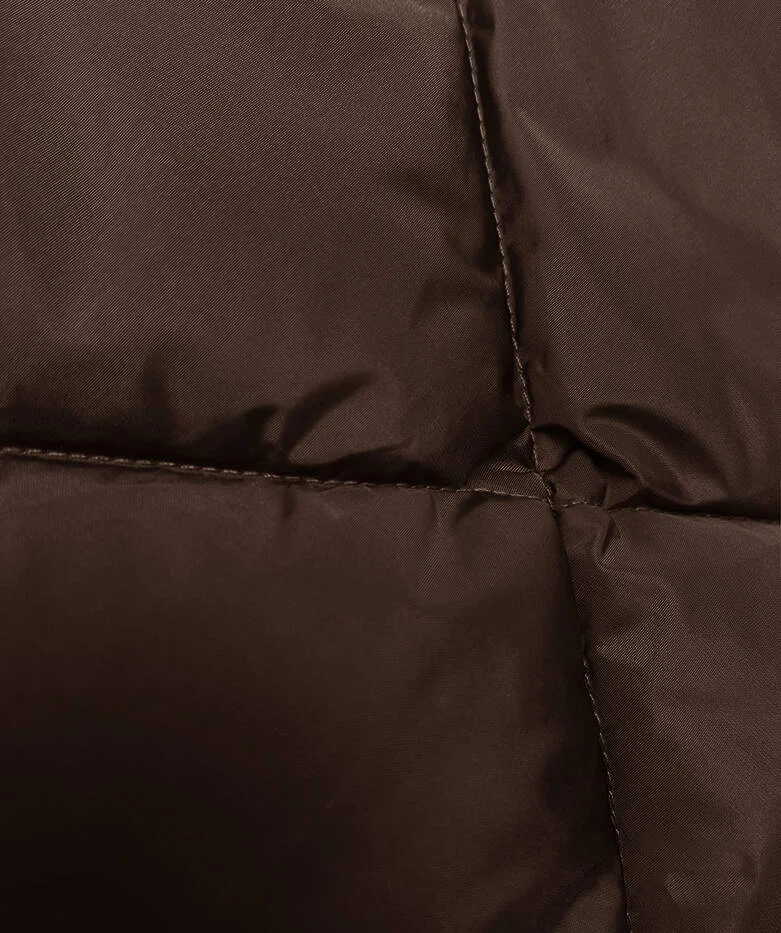 Bunda má jednoduchý střih, je zateplená syntetickou péřovou výplní a má kožešinovou podšívku. Model má dvě kapsy bez zapínání a zapíná se zipem. Bunda má velký límec a kapuci, kterou je možné odepnout. V pase modelu je ozdobná šnůrka. Na koncích rukávů jsou skryté stahovací lemy. Model má délku pod kolena.